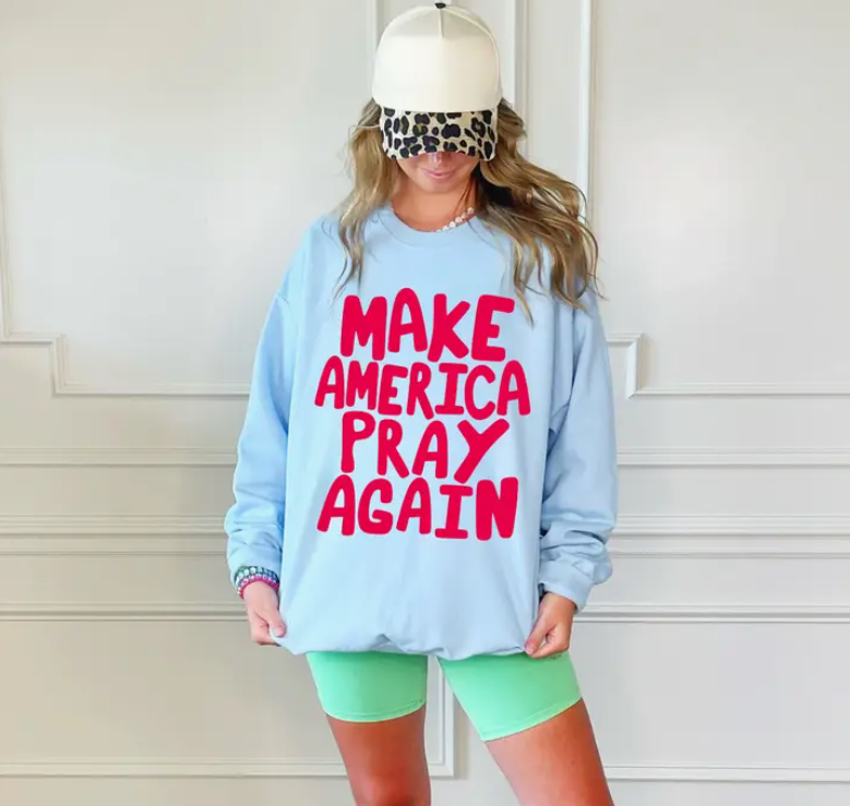 Cozy meets statement style in this light blue crewneck sweatshirt. Featuring “Make America Pray Again” in bold red puff lettering, it’s a playful nudge to keep faith front and center. The oversized, relaxed fit pairs perfectly with leggings and sneakers for an easygoing, comfy vibe you’ll reach for again and again. Soft, stylish, and full of heart—this sweatshirt is made to brighten your wardrobe and your day!