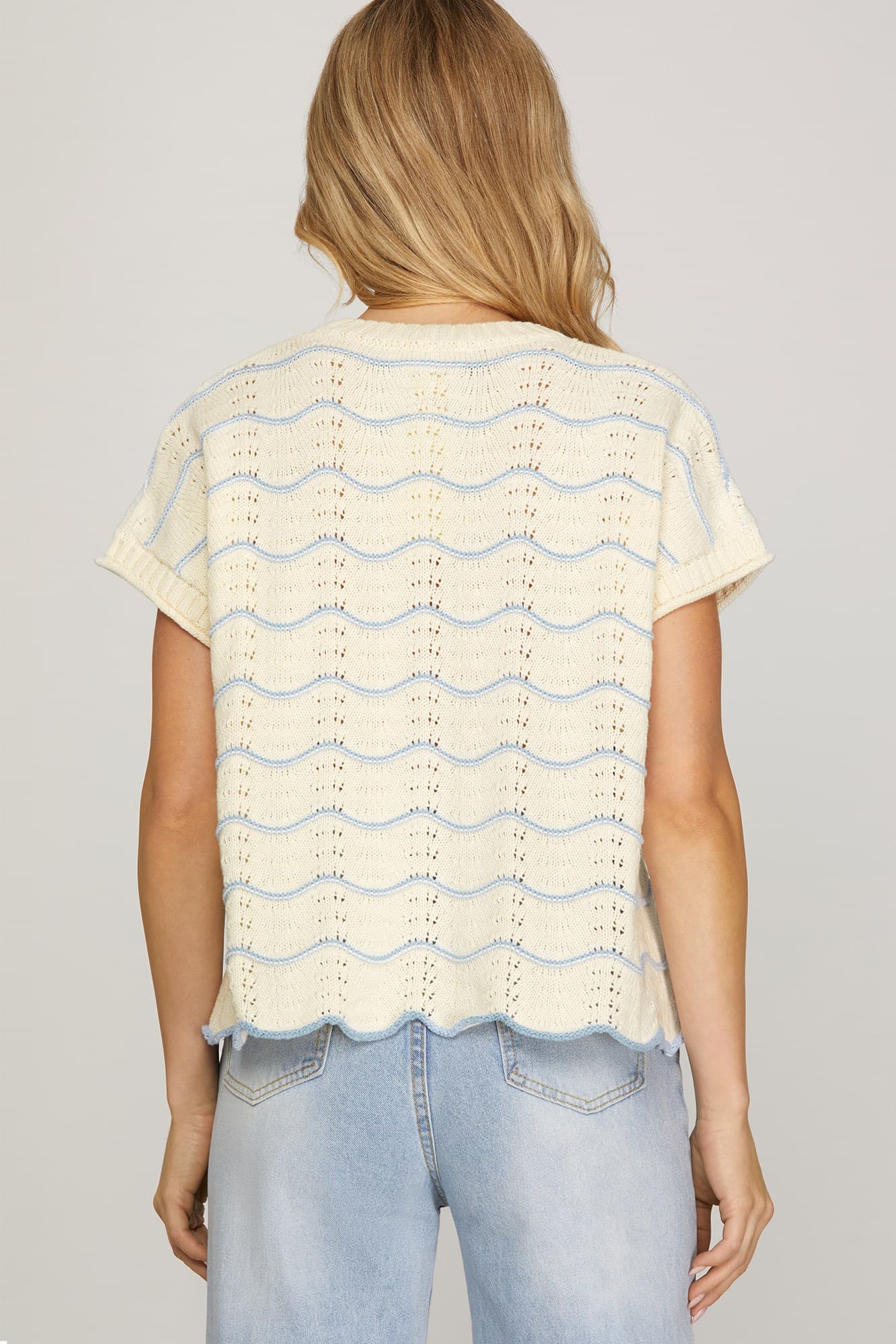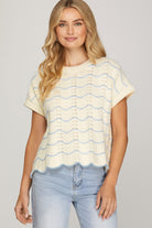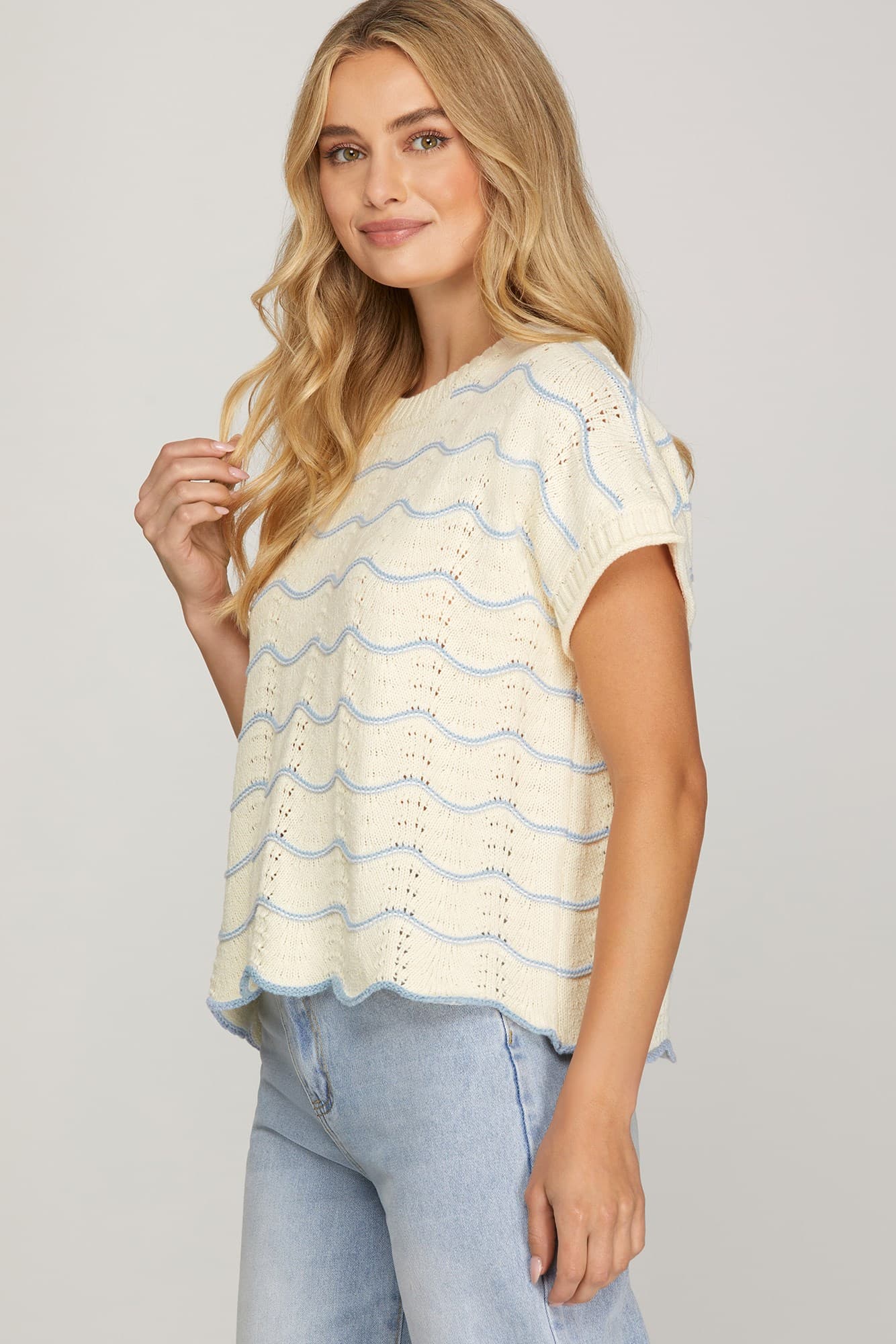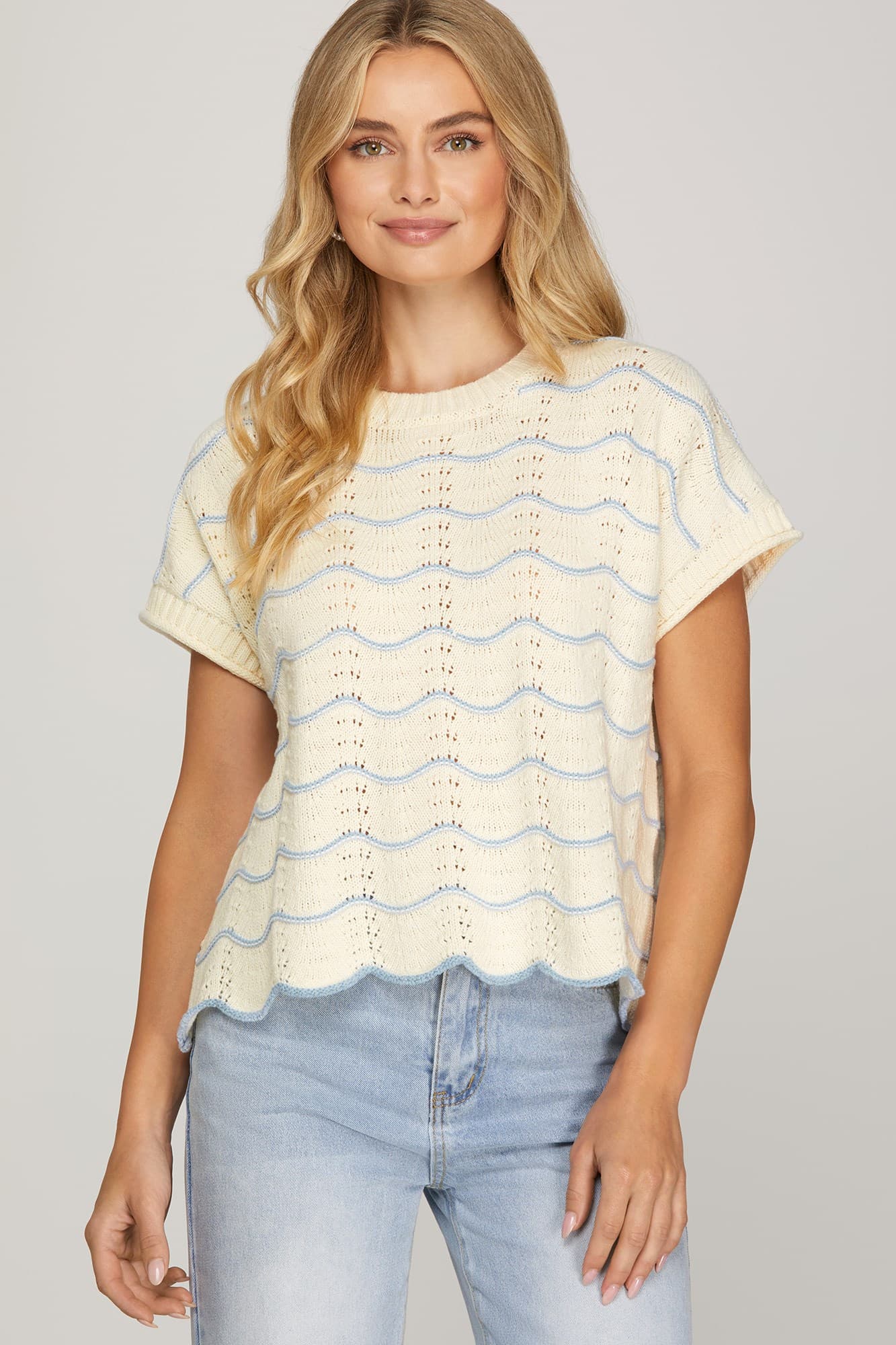 Meet your new everyday classic—this short-sleeve knit sweater top features a relaxed drop-shoulder silhouette with a sweet scallop trim that adds the perfect feminine touch. Designed in a clean striped pattern, it’s lightweight, easy to style, and ideal for year-round wear. Pair it with denim, trousers, or skirts for an effortless, polished look.
