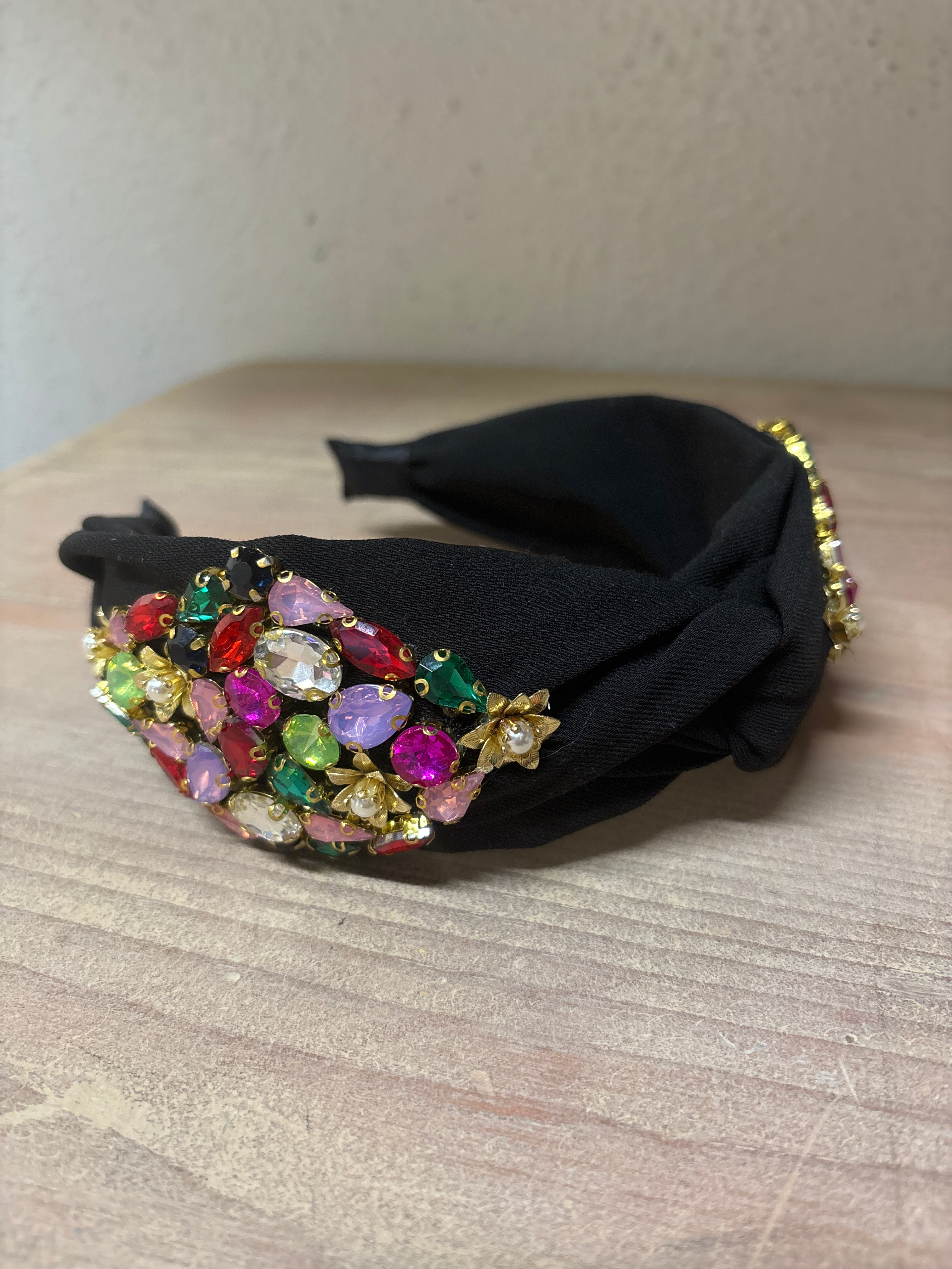 Celebrate the season in style with our Black Multicolor Jeweled Knot Headband — a dazzling accessory made to shine at every holiday occasion. Crafted from sleek black fabric and finished with a chic knotted design, this headband is adorned with vibrant, multicolored jewels that catch the light beautifully from every angle.