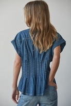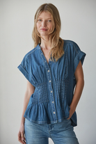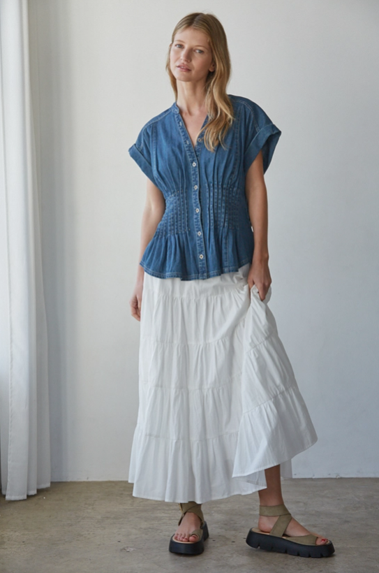 Delicate pleated detailing adds subtle texture and dimension, while the classic button-down front keeps the look timeless and versatile. The short sleeves provide easy, warm-weather wear, making it ideal for both office styling and casual outings. Designed to drape beautifully without clinging, this piece pairs effortlessly with tailored trousers, denim, or skirts.