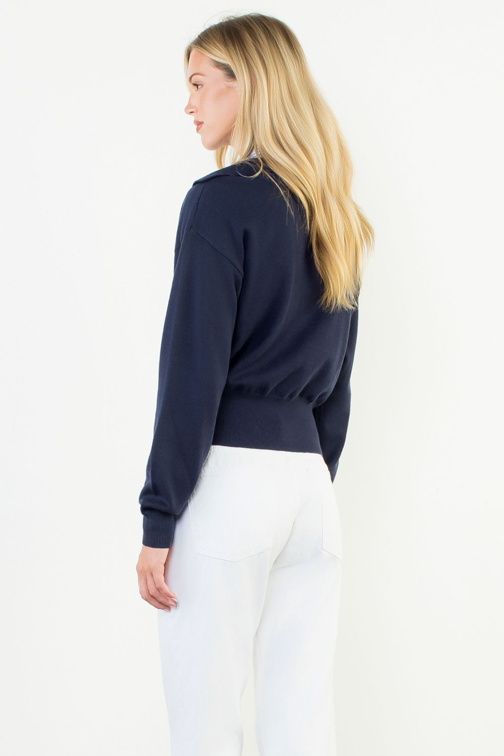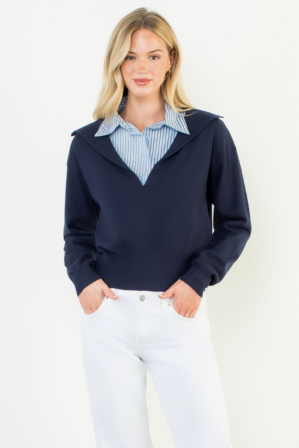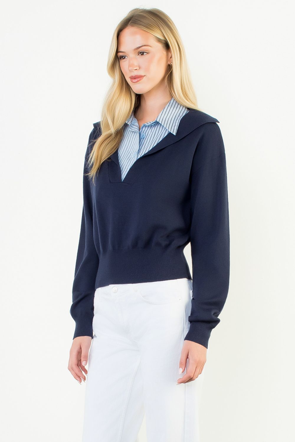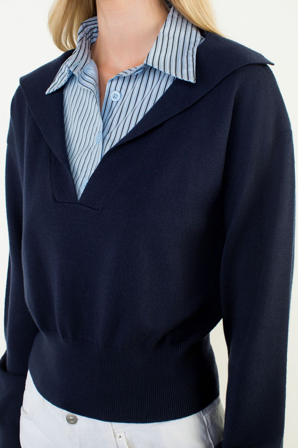 This refined top features a smooth, mid-weight navy knit that shapes elegantly through the shoulders and torso, ending at the hip for an effortlessly polished silhouette. Designed with a built-in shirt-layer effect, the underneath collared shirt peeks through with crisp white fabric adorned in slim navy vertical stripes, giving subtle visual interest and lengthening the line. The pointed collar sits neatly above the knit neckline, and the shirt cuffs extend slightly past the knit sleeves for tailored detail.