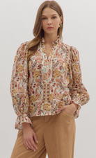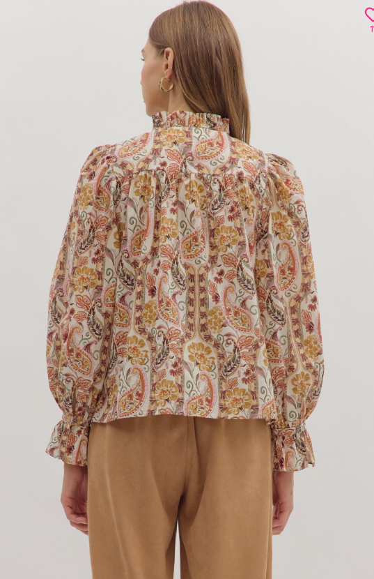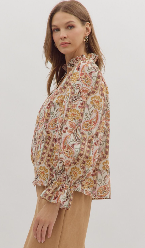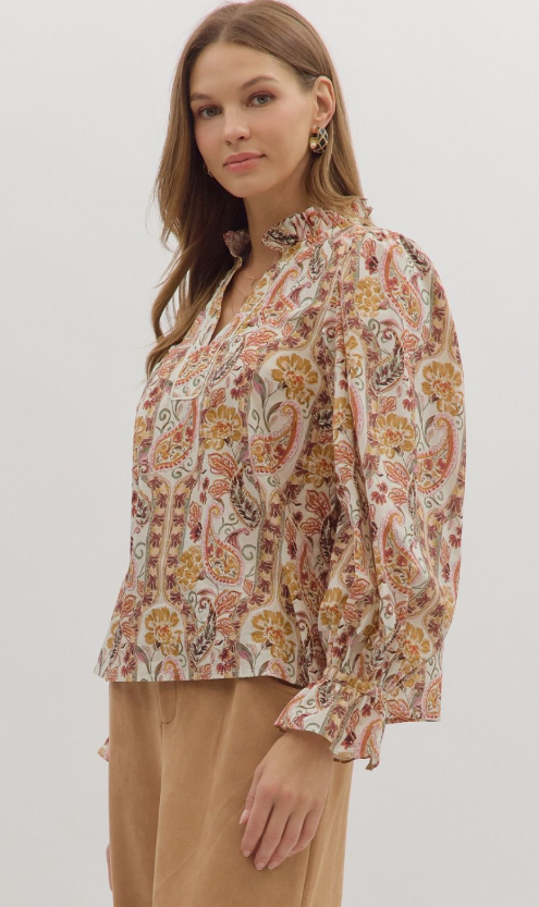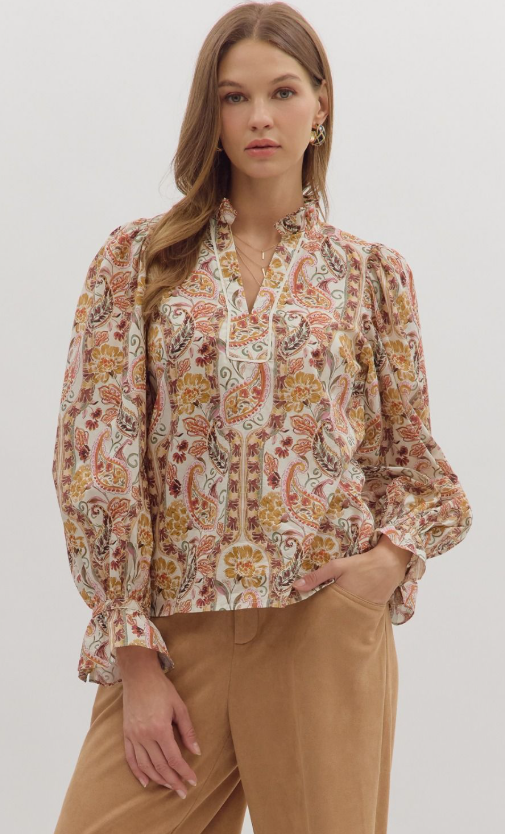 Elevate your everyday style with the Paisley Top! This lightweight, unlined long sleeve top features a delicate paisley print, ruffle band collar, and a flattering V-neckline. Buttoned cuffs with subtle ruffle edges add a refined, feminine touch. Perfectly paired with your favorite jeans, it’s an easy way to achieve a polished, elevated look for any occasion.