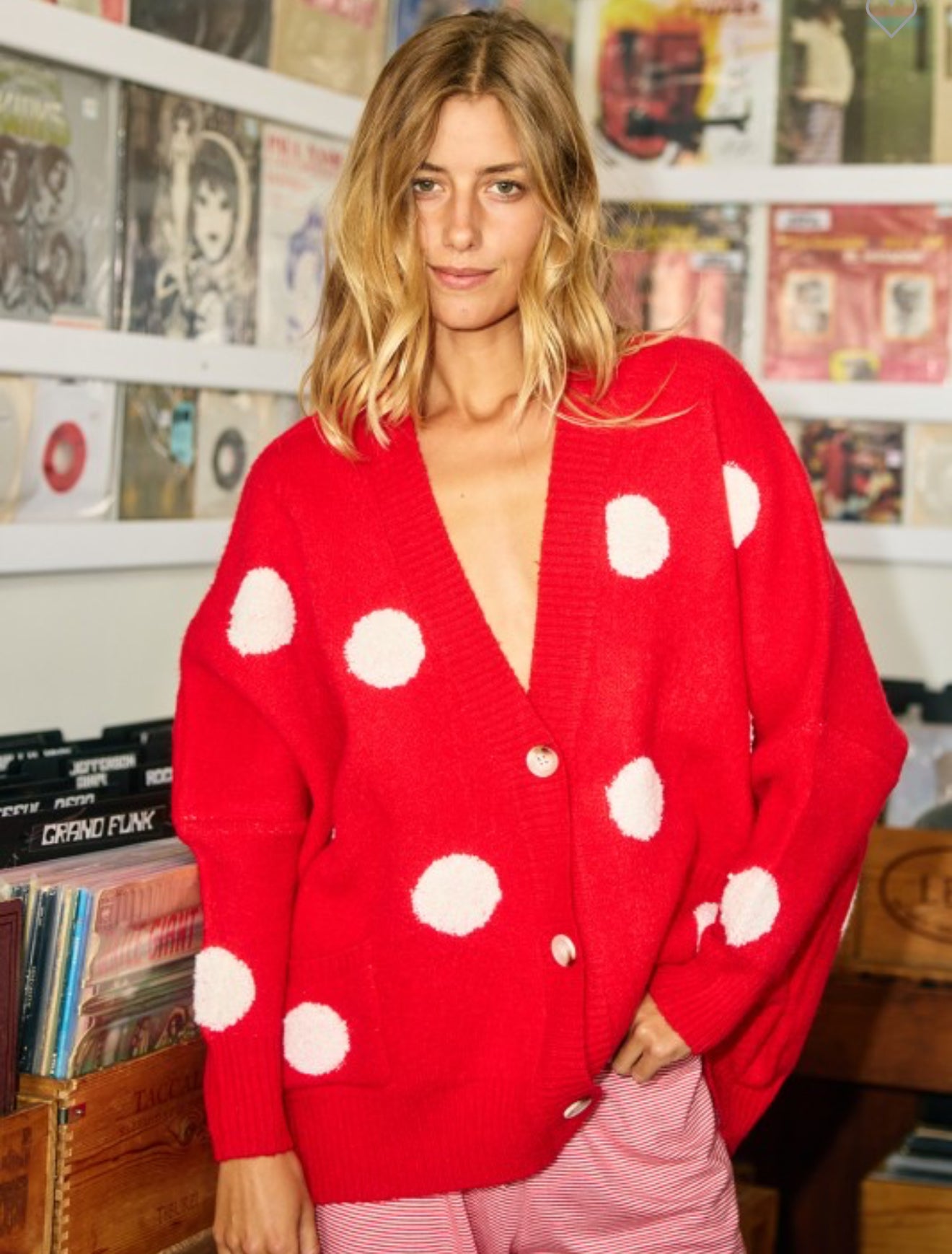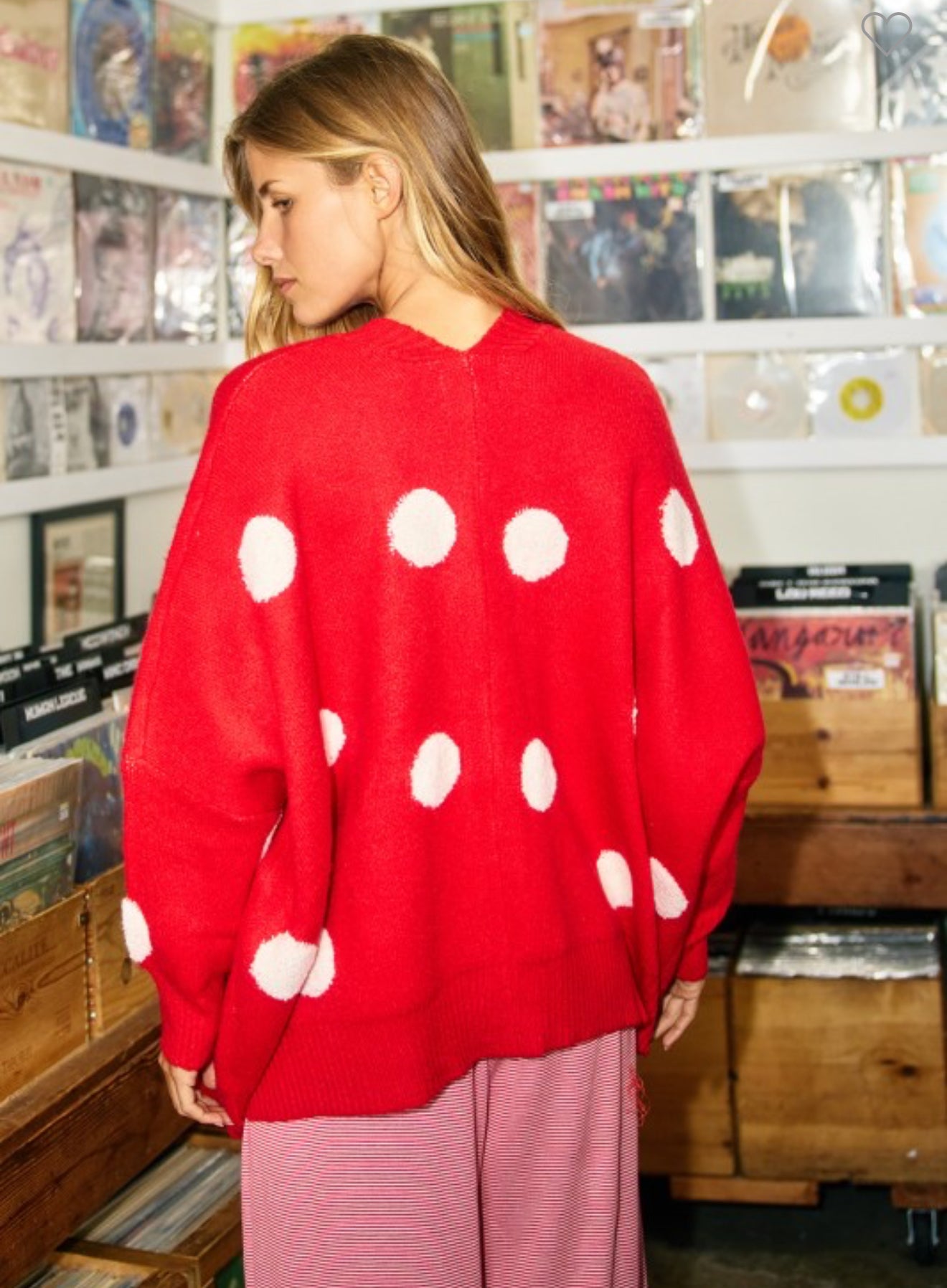 Cozy meets playful in this statement-making cardigan. Designed with a relaxed oversized fit, this red pullover features classic white polka dots for a fun, timeless look. The drop-shoulder sleeves create an effortless, slouchy silhouette, while the open-front button-down design makes it easy to layer over your favorite tees and tanks. Finished with functional side pockets for everyday comfort, this sweater is soft, cozy, and perfect for adding a pop of personality to any outfit.