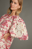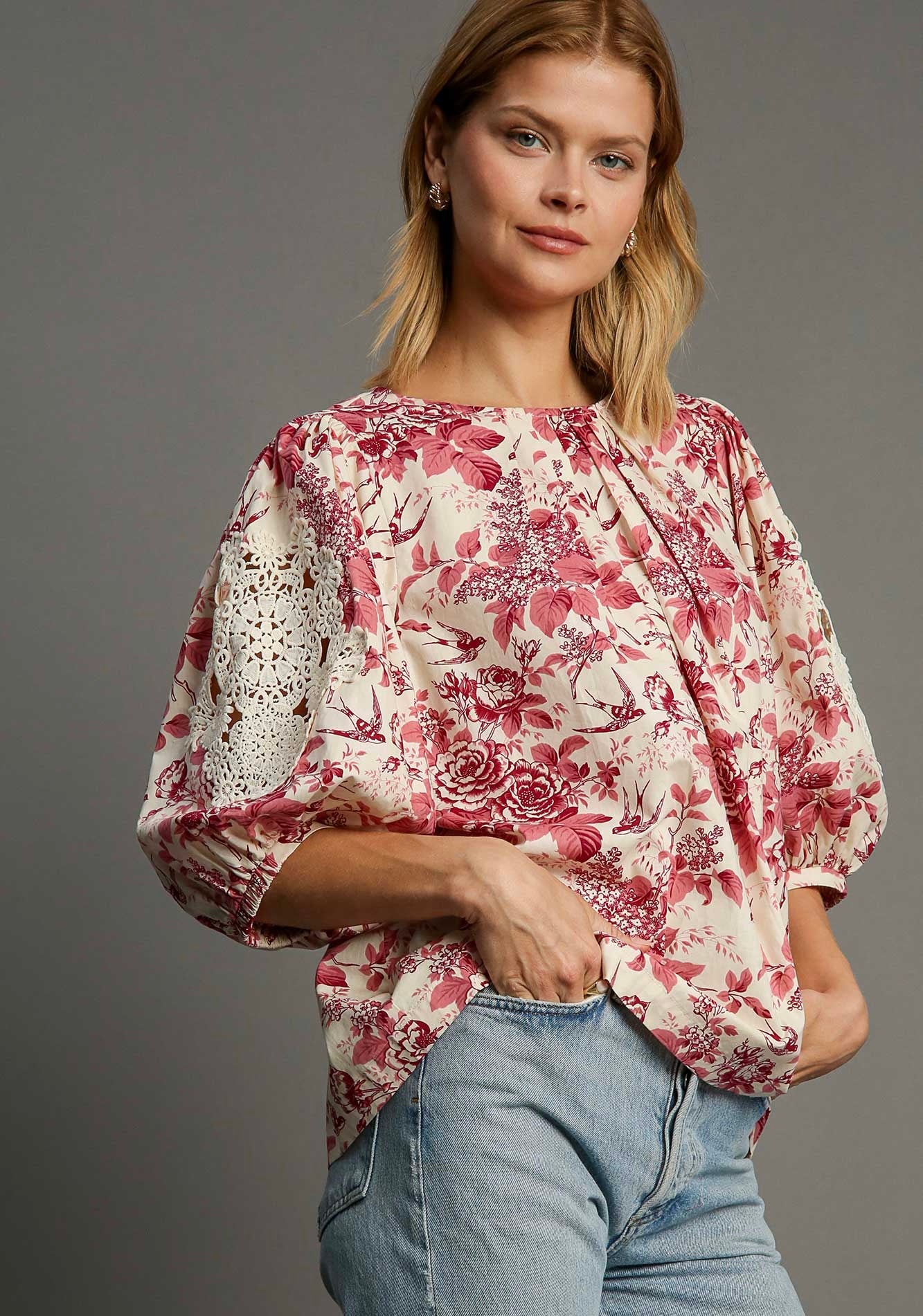 This top is romantic, elevated, and full of thoughtful detail đžAÂ cream-based blouse adorned with a soft rose floral print in warm pink tones, giving it a timeless yet feminine feel. Designed with a gently gathered neckline that creates a flattering drape through the bodice, it features statement puff sleeves finished with delicate crochet lace insets for added texture and charm. The structured shoulder and voluminous sleeve balance beautifully with the relaxed fit, making it both polished and easy to wear.