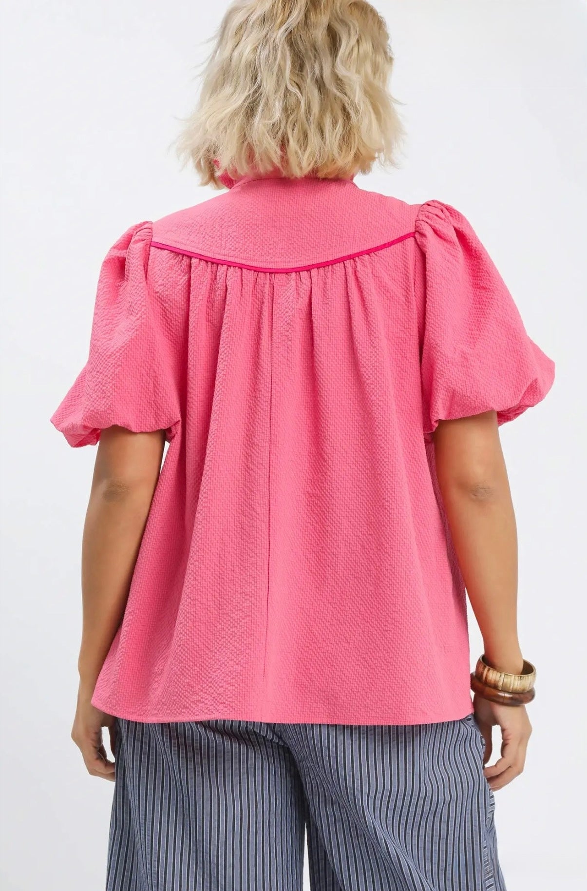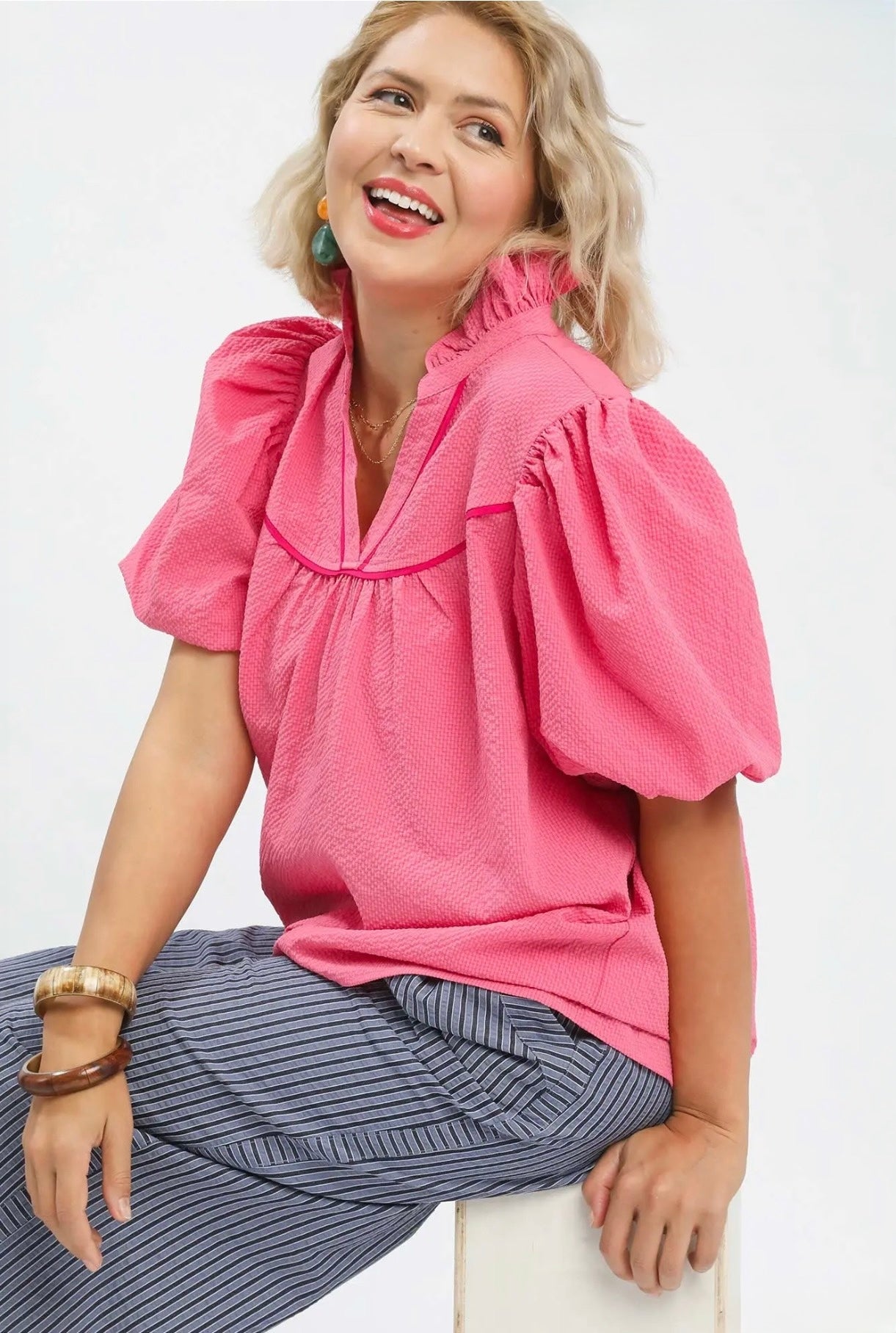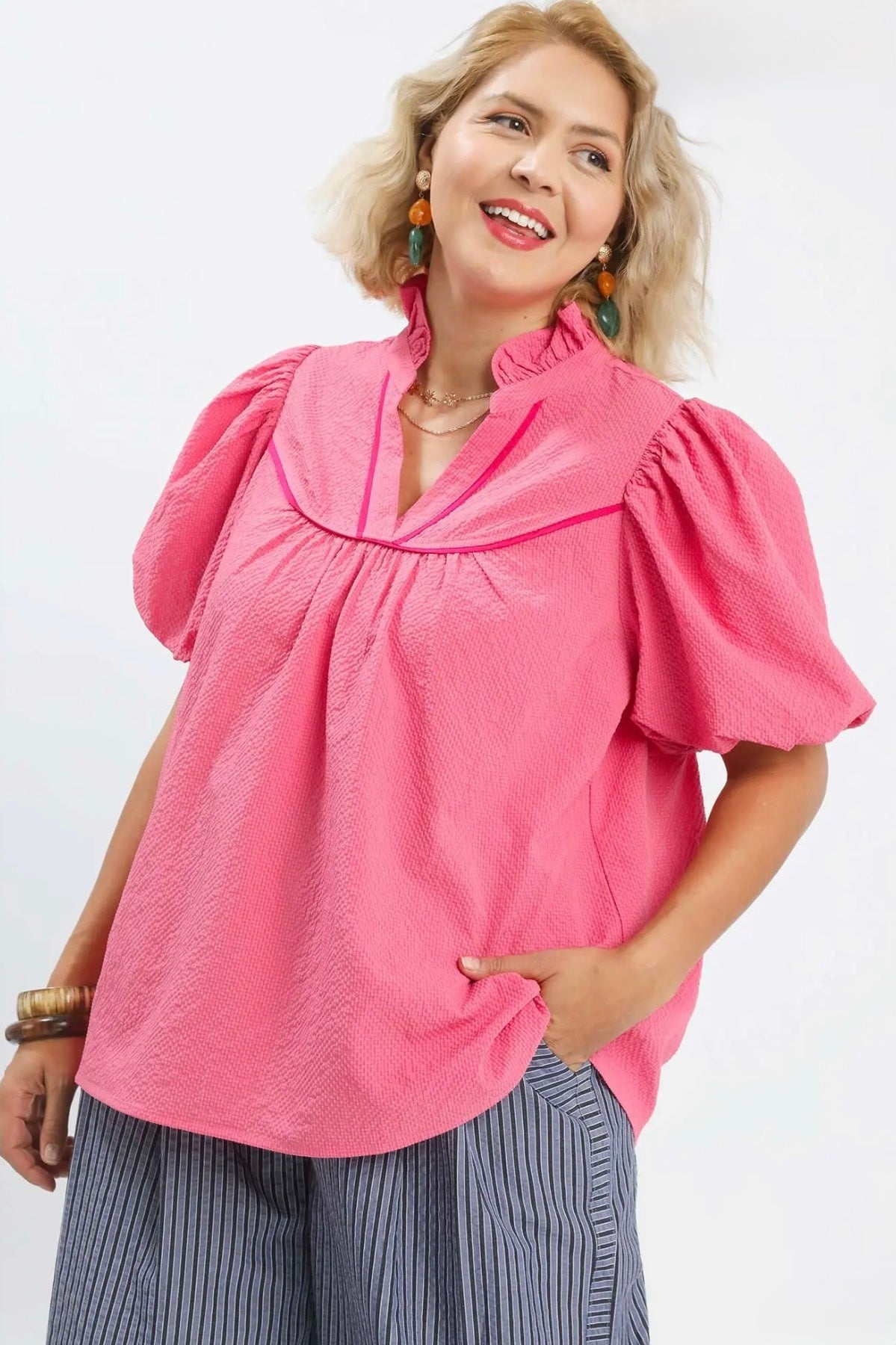 Elevated yet easy to wear, this textured top brings subtle statement details to your everyday look. Designed with a soft ruffle mock neckline and a flattering V-cut accent finished with contrast trim, it adds just the right amount of dimension. The puff short sleeves create a feminine silhouette, while the lightweight, unlined fabric keeps it breathable and comfortable. Perfect for dressing up denim or pairing with tailored pieces for a more refined feel.