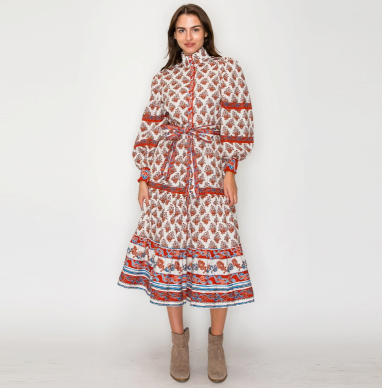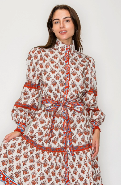 A poetic fusion of artful prints and effortless elegance — this dress is crafted from 100% breathable cotton with a soft, natural drape. The fully open shirt-front design adds versatility, while the belted waist and side pockets bring both ease and structure. Delicately accented with earthy terracotta and sky-blue tones, this piece evokes a sense of wanderlust and timeless femininity. Perfect for spring days, weekend escapes, or simply feeling beautiful in the everyday.