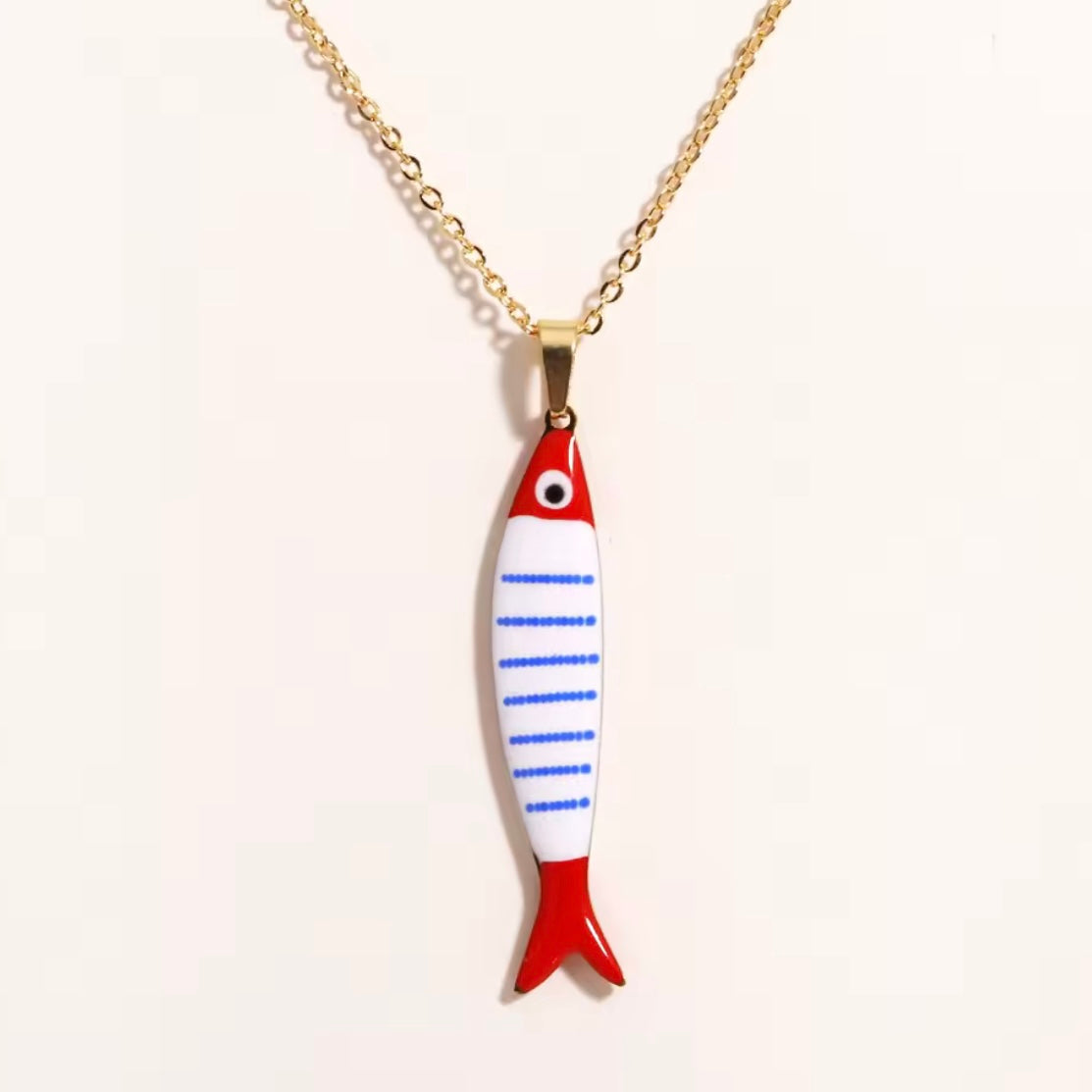 Meet the Sardine Pendant Necklace—a playful yet refined statement piece for everyday wear. Crafted from durable stainless steel with a glossy enamel sardine charm, it features crisp white, red, and blue detailing for a fresh, modern look. Lightweight and eye-catching, it’s perfect for layering or wearing solo. A charming gift or a unique addition to your boutique jewelry collection.