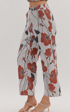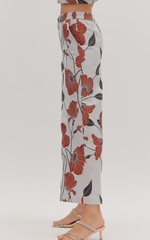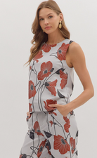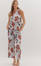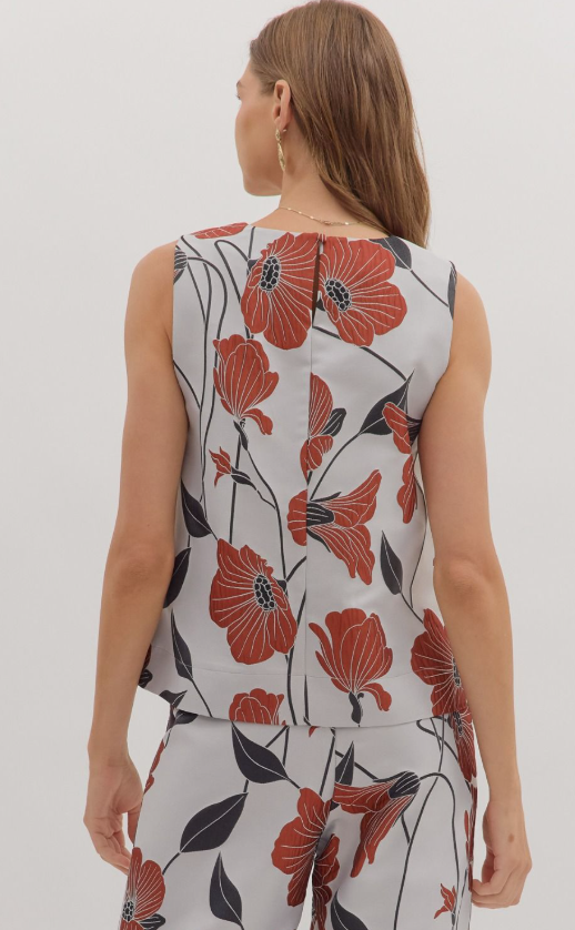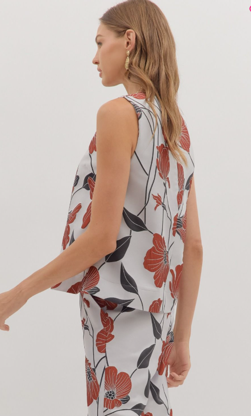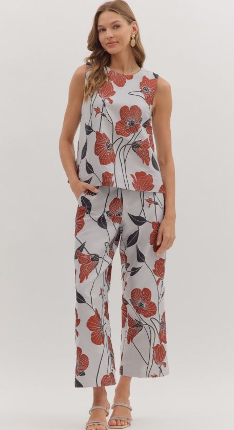This chic floral print ensemble features a sleeveless top and matching pants in a sleek silver base, accented with vibrant pops of red and black. Perfect for a polished yet playful look, it’s ideal for brunches, casual outings, or a day at the office. Pair with neutral heels or sandals to let the bold floral pattern shine.