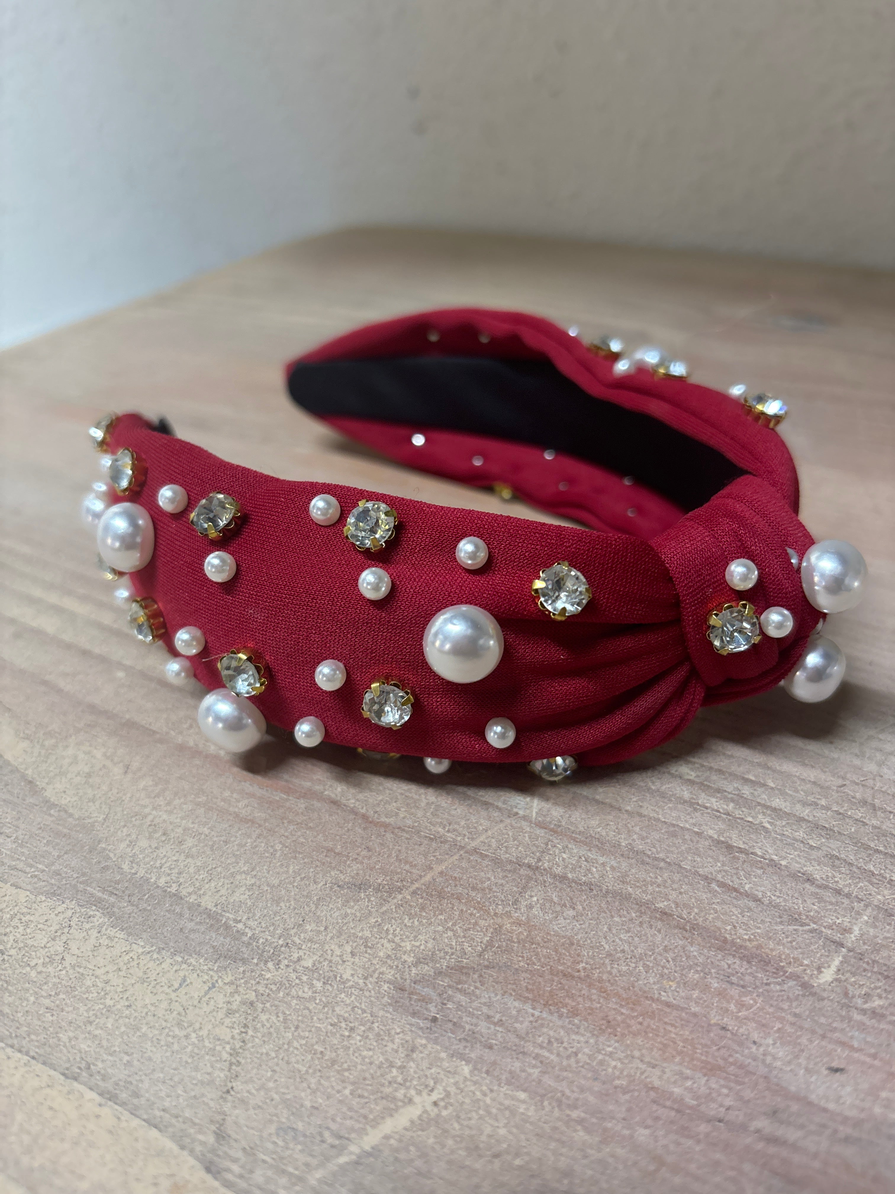 Make a bold yet refined statement with our Red, Pearl & Jewel Knot Headband. Wrapped in rich, ruby-red satin, this striking accessory features a signature knotted design at the crown for a touch of timeless charm.