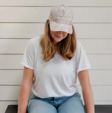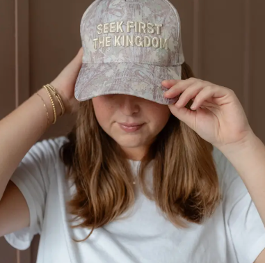 Seek First The Kingdom Hat in Light Wash Camo Channel your inner adventurer with this playful take on timeless faith-inspired style. Crafted in a soft light wash camo, this hat blends spiritual messaging with laid-back vibes—perfect for those who wear their values with a wink and a smile. Whether you're heading to brunch, the beach, or just living your best life, this hat keeps the good vibes close and your look effortlessly cool. A conversation starter that proves faith and fashion go hand in hand.