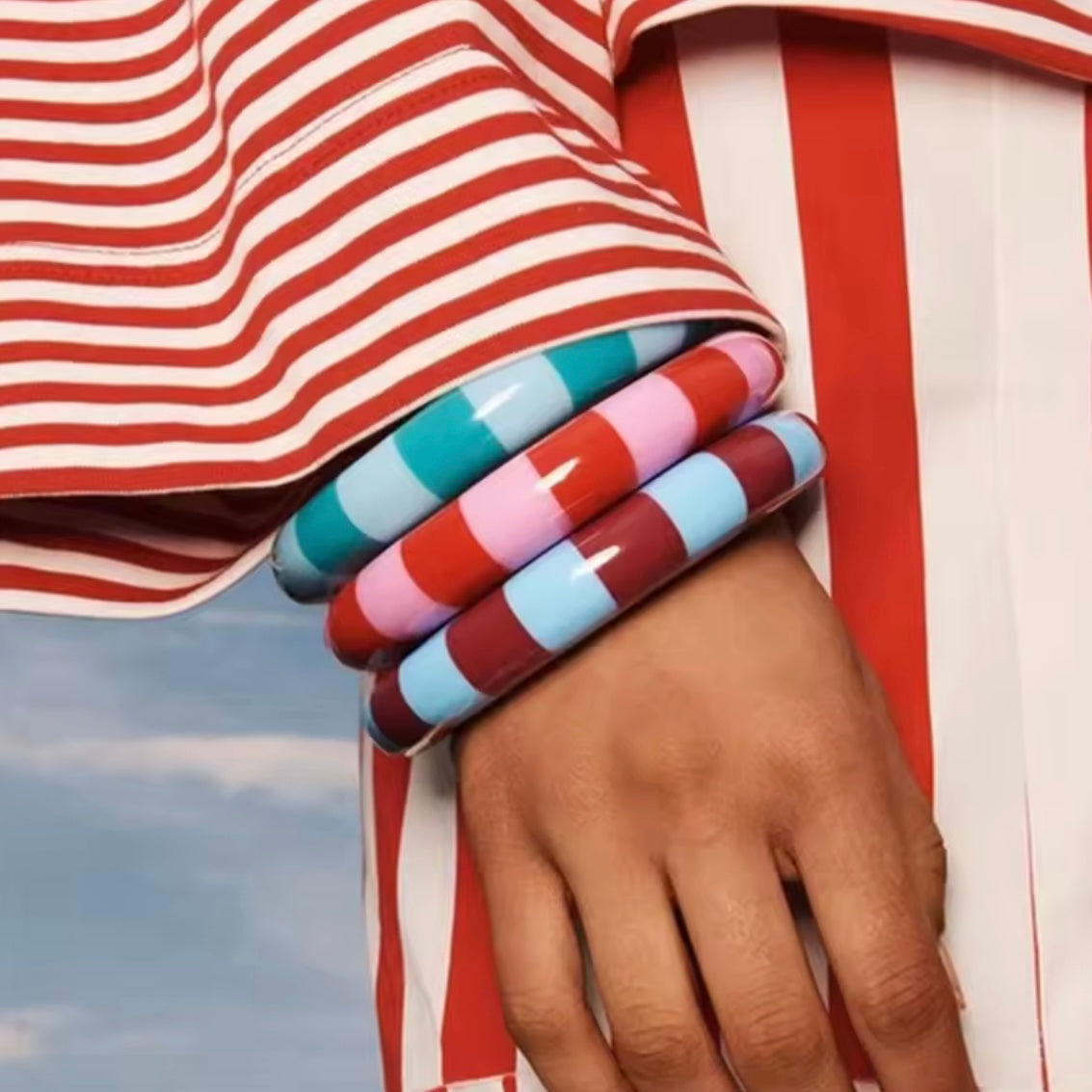 Vibrant striped resin bangles, lightweight and smooth with a bold pop of color. Perfect for stacking or wearing solo for an effortless boutique-chic look.