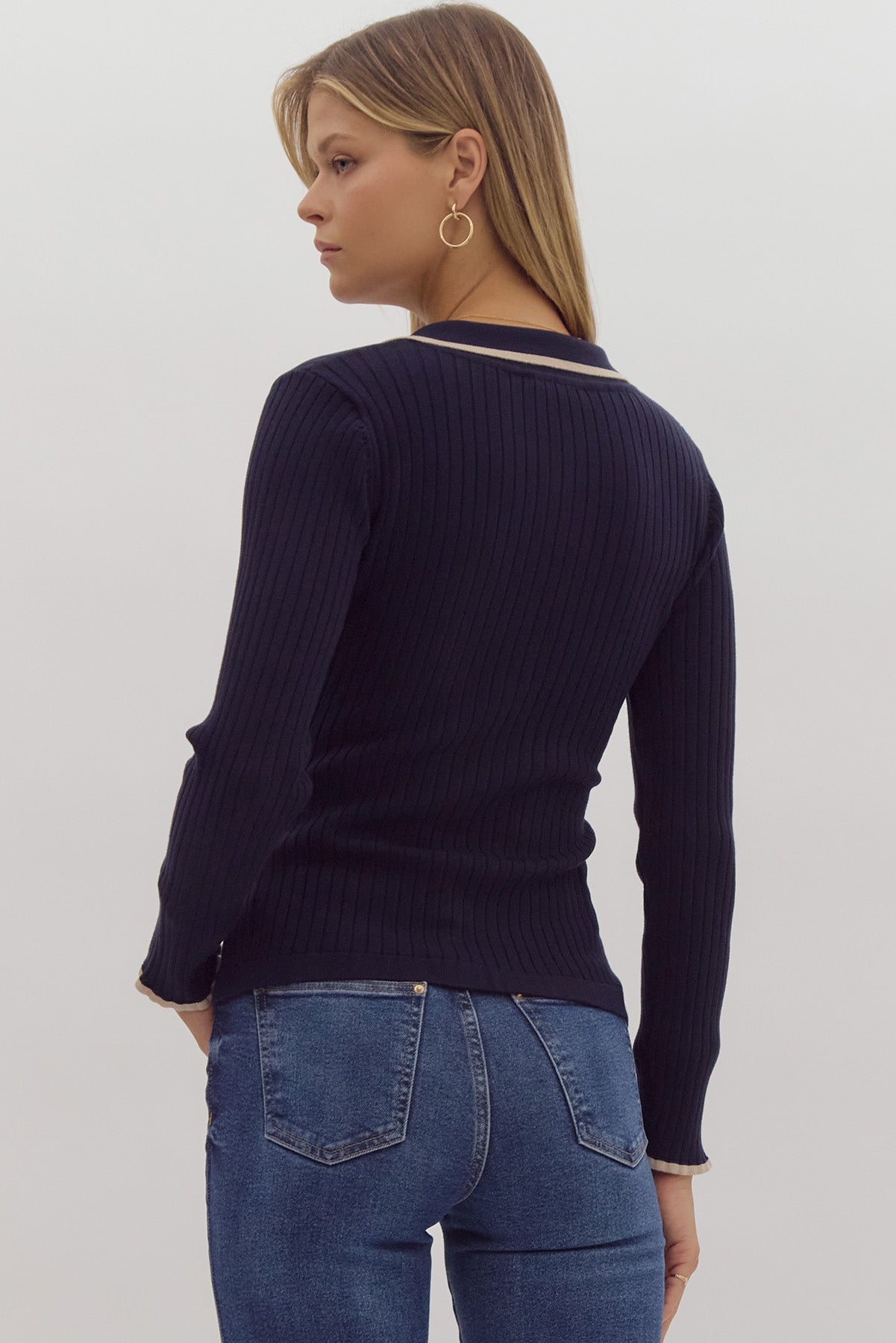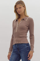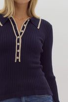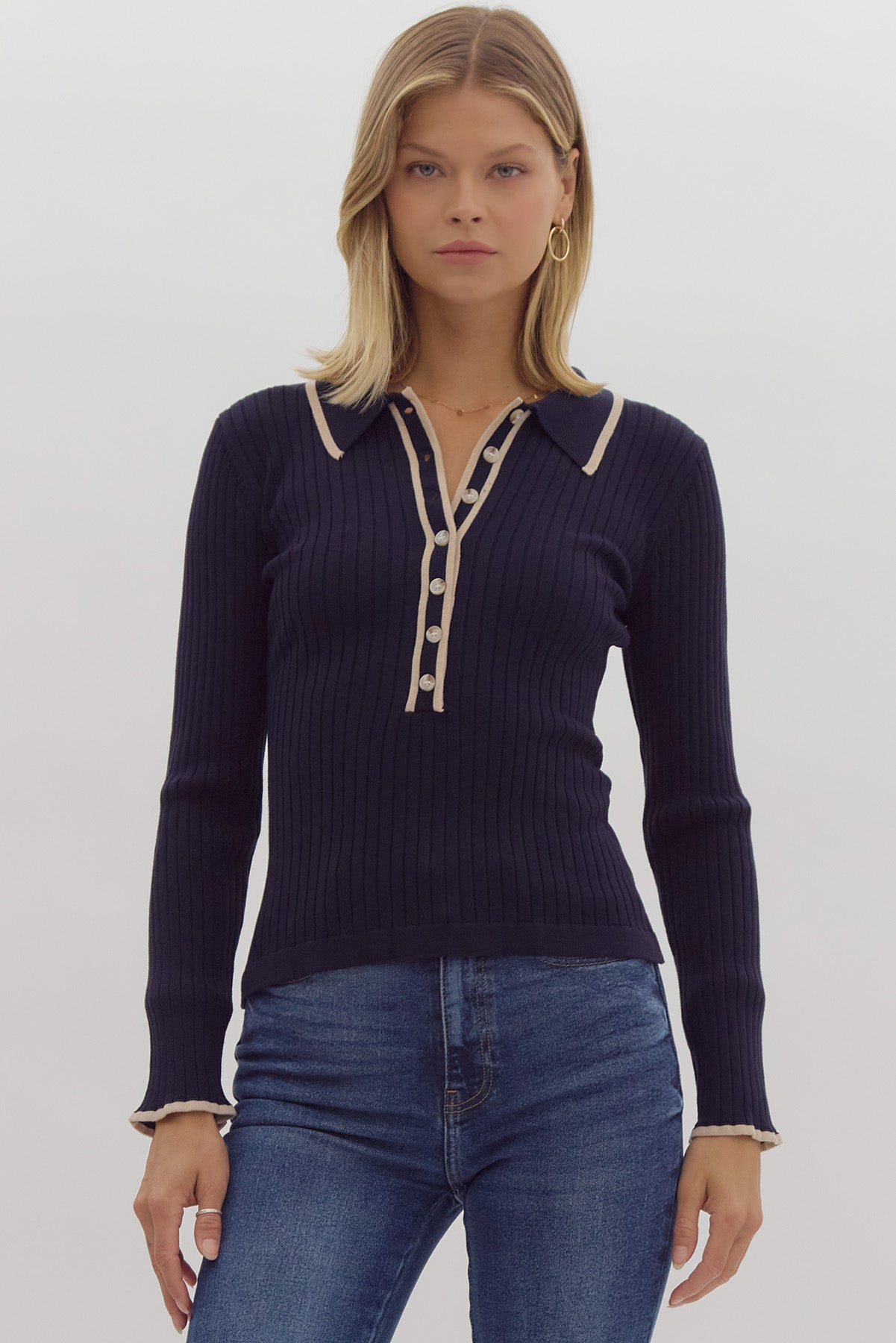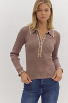 Elevate your everyday style with this solid ribbed long sleeve collared knit top, designed with a flattering, modern fit and thoughtful details throughout. The button-up bust adds a touch of chic structure, while the contrasting solid trim gives the piece a clean, elevated finish. Crafted in a lightweight, non-sheer knit, it offers comfort without compromising style and layers beautifully under jackets or stands effortlessly on its own.