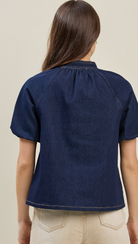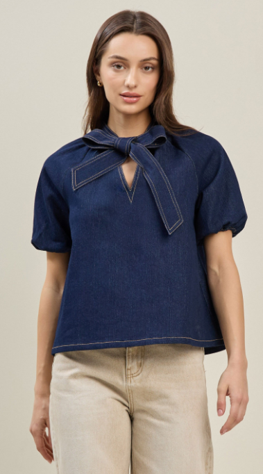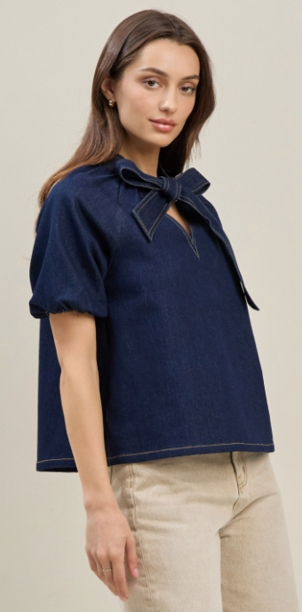 This bow denim blouse is a fresh take on a timeless staple. Crafted from soft stretch denim, it offers a comfortable fit while maintaining a structured, flattering shape. The feminine V-neckline is accented with a charming bow detail, adding a playful yet polished touch. Short sleeves make it perfect for warmer days, while the versatile denim finish allows for easy styling—dress it up with tailored trousers or keep it casual with your favorite jeans or skirt. A go-to piece for effortless, everyday chic.