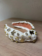 Show your Texas pride in style with our White Jeweled Knot Headband, featuring a chic gold Texas emblem at its center. This elegant piece showcases a classic knotted design that flatters every hairstyle.