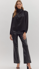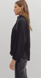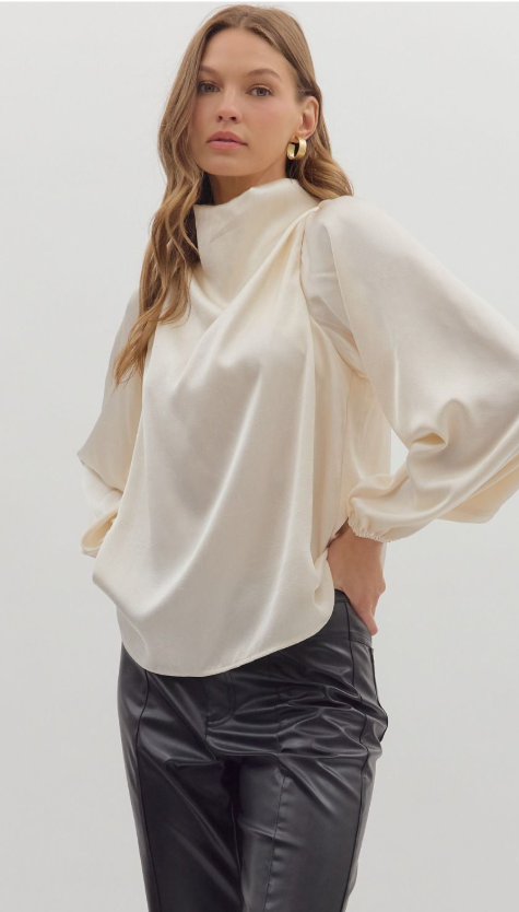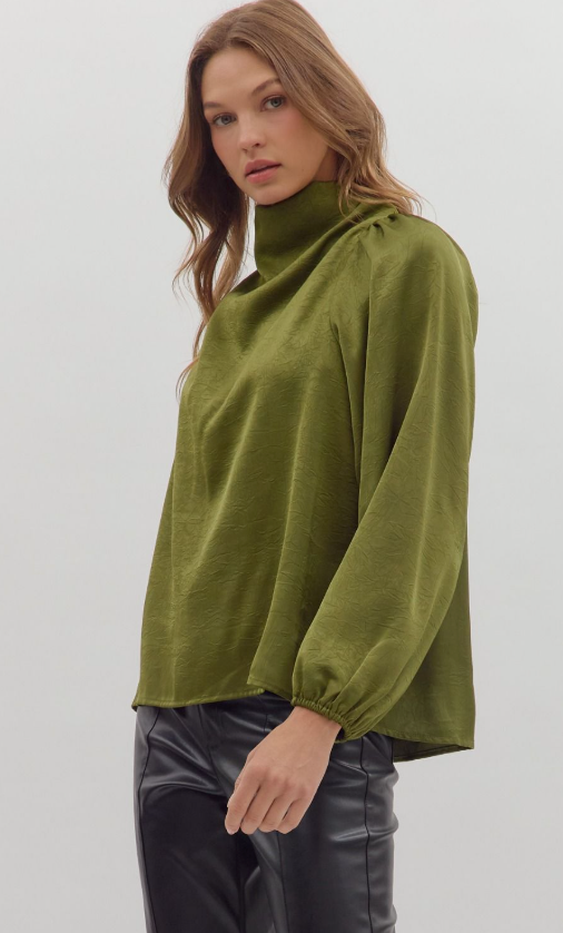 Sophisticated and sleek, this solid long sleeve top features a softly draped mock neck and a back keyhole with a button enclosure for an elevated touch. Crafted from a lightweight woven fabric with a subtle shimmer. Perfect for pairing with tailored trousers or denim, this top effortlessly transitions from day to night.