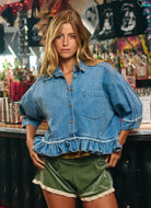 Meet your new throw-on-and-go favorite 🤍 This lightweight denim top blends casual cool with a flirty, feminine finish. Designed in a relaxed, boxy fit, it features soft washed chambray, snap-front buttons, and a single chest pocket for that effortless everyday feel. The cropped peplum hem with raw frayed detailing adds movement and shape, while the voluminous balloon sleeves keep the look elevated and boutique-worthy.
