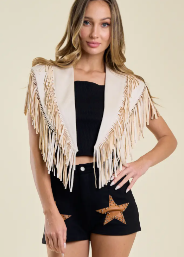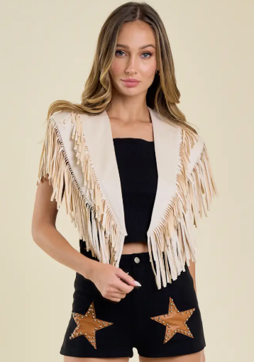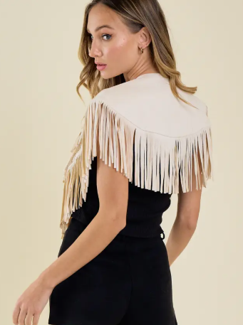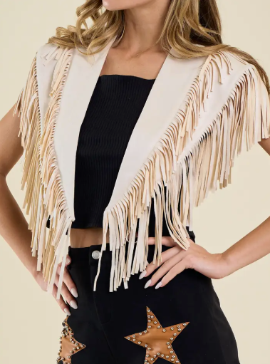 Add a touch of western elegance to any outfit with this cream suede fringe shrug. Crafted in a soft, velvety suede-feel fabric, this open-front piece features a structured collar and dramatic fringe detailing that moves beautifully with every step. The cropped shrug silhouette layers effortlessly over dresses, denim, or tops, making it a versatile statement piece for festivals, nights out, or elevated casual looks. With its blend of vintage western charm and modern styling, this shrug brings instant character and texture to your wardrobe.