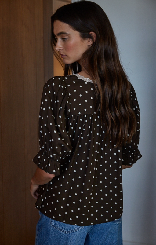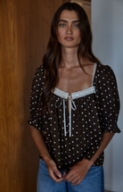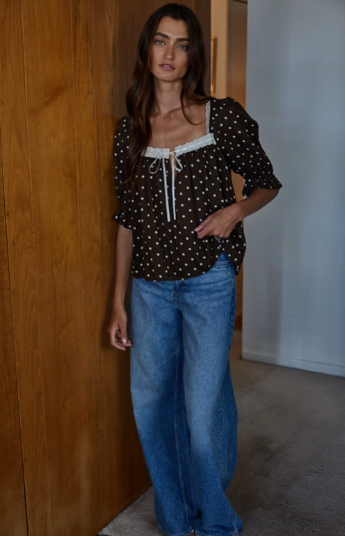 Crafted from soft, breathable cotton with a hint of stretch, it keeps you comfortable through long days in the sun or under the arena lights. The rich brown base is accented with playful white polka dots, giving it a timeless yet spirited Western feel. Traditional snap buttons, double chest pockets, and a flattering tailored fit make it rodeo-ready and photo-worthy.