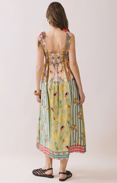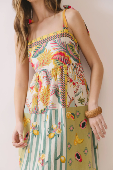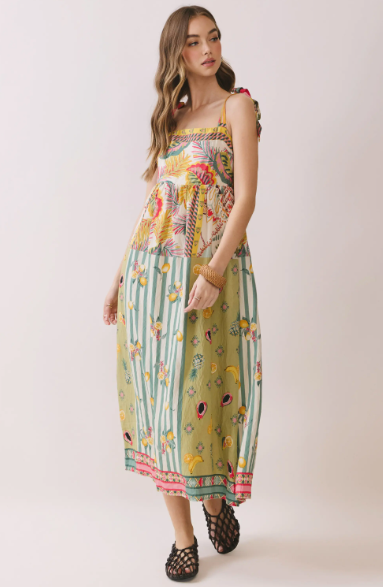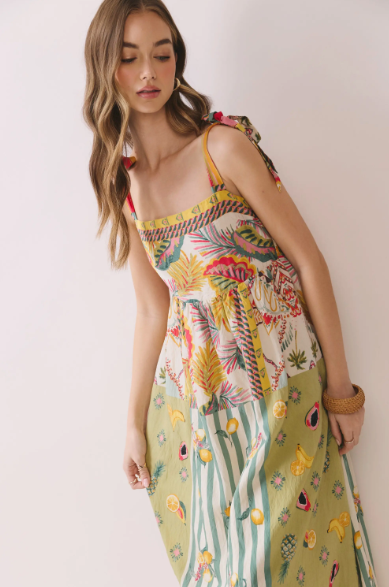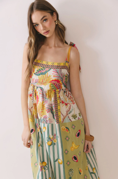 Effortlessly feminine and full of charm, this breezy midi dress is perfect for warm days and relaxed occasions. Crafted from a lightweight, flowy fabric, it features a soft sage-green base adorned with delicate floral prints and subtle botanical patterns. The bodice showcases vibrant multicolor detailing with intricate tropical-inspired motifs, creating a beautiful contrast against the skirt.