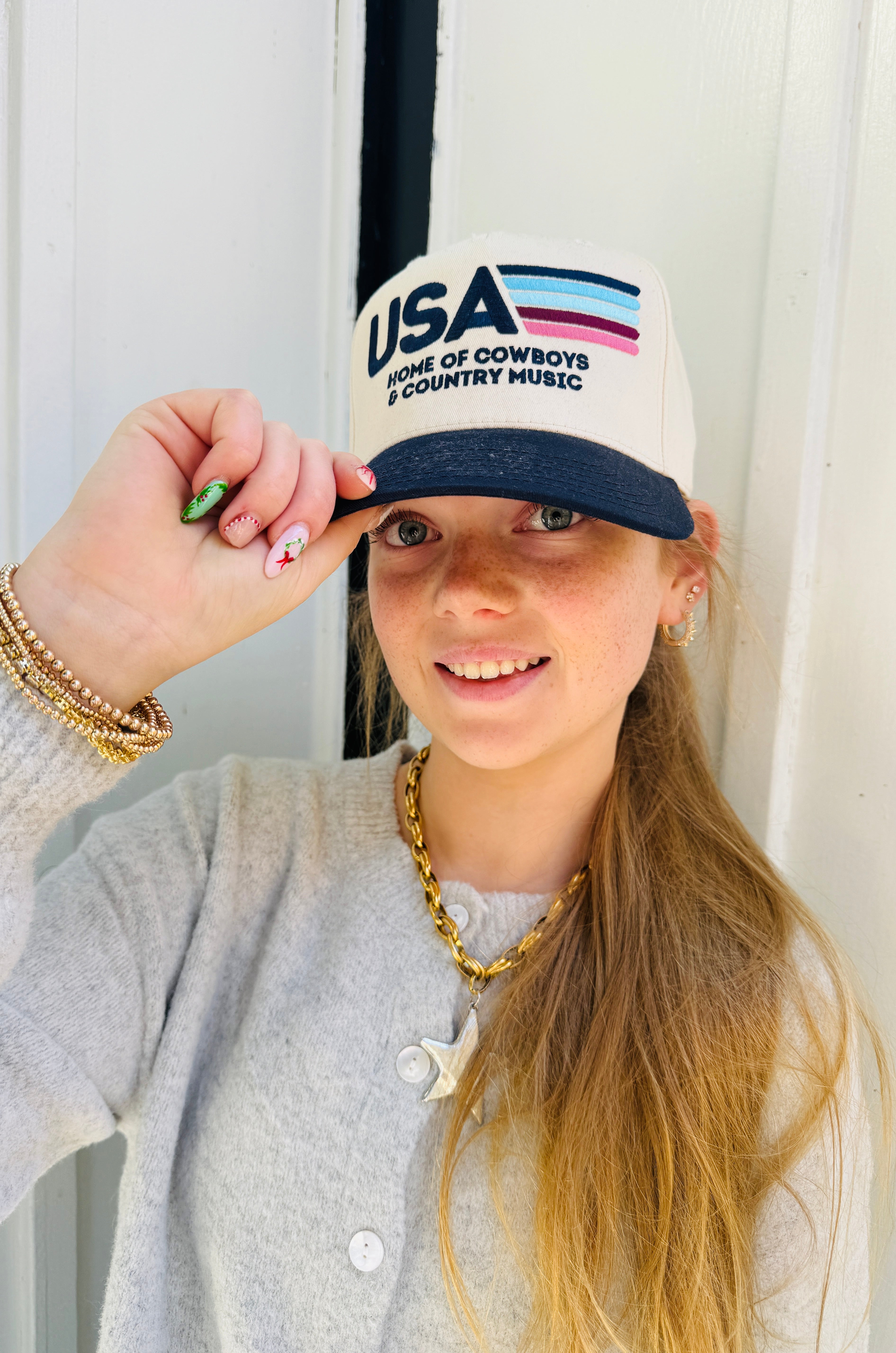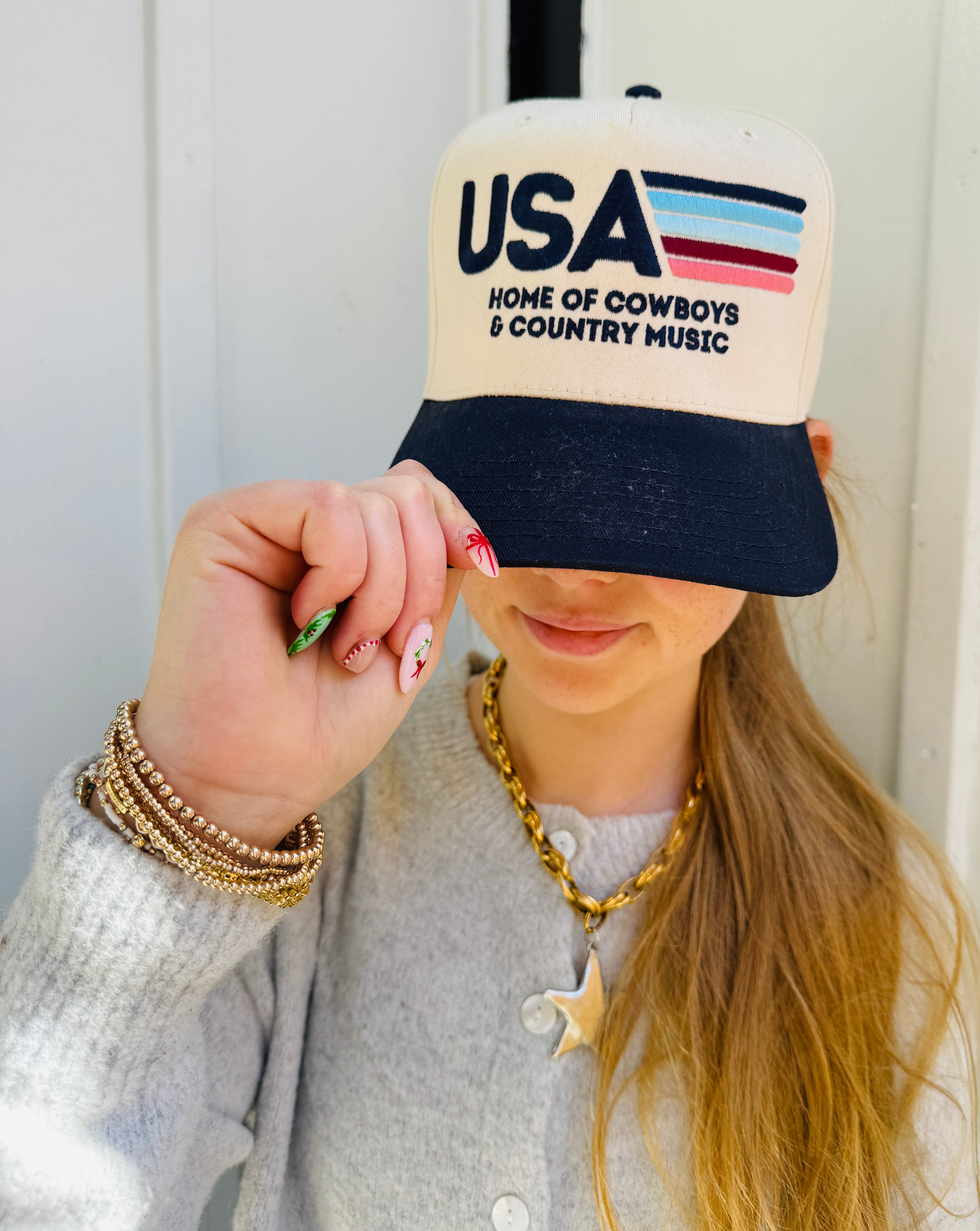 Style Tip: Wear it with cutoff shorts and ankle boots for summer shows, or layer it under your favorite jacket on cooler nights — this hat brings USA pride + country soul to every outfit.