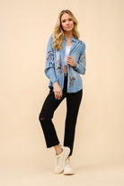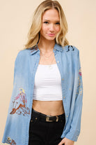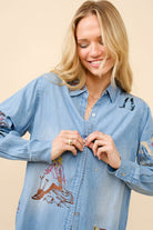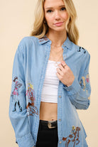 A medium wash denim Tencel™ button-up shirt featuring a beautifully embroidered western motif. Lightweight with a soft, drapey feel, this piece blends timeless western style with everyday comfort—perfect worn on its own or layered year-round.