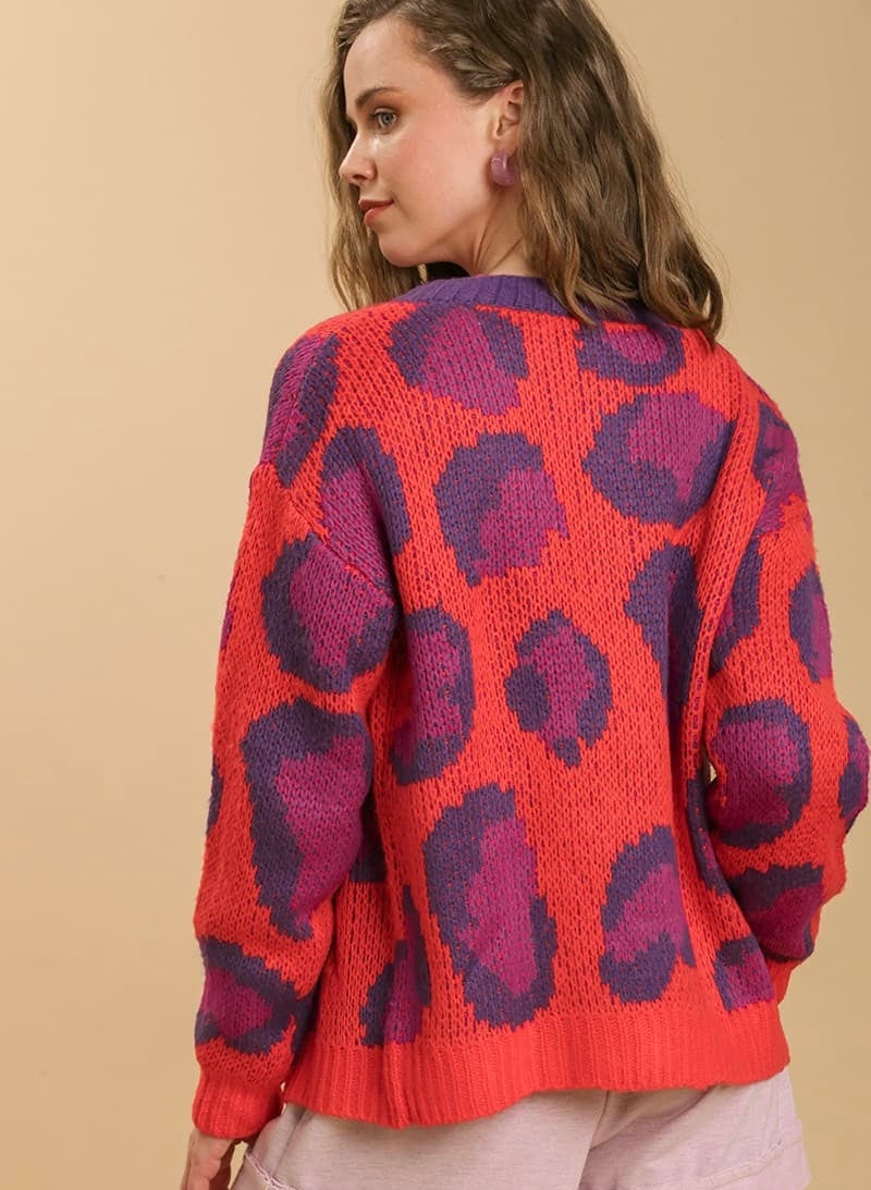 Make a bold statement with this eye-catching animal print button-front cardigan in a stunning red mix. Designed with a soft, cozy knit and a pop of playful pattern, this cardigan adds instant personality to any outfit. The button-down front gives you styling versatility—wear it open over a tank or tee, or button it up for a chic, polished look.
