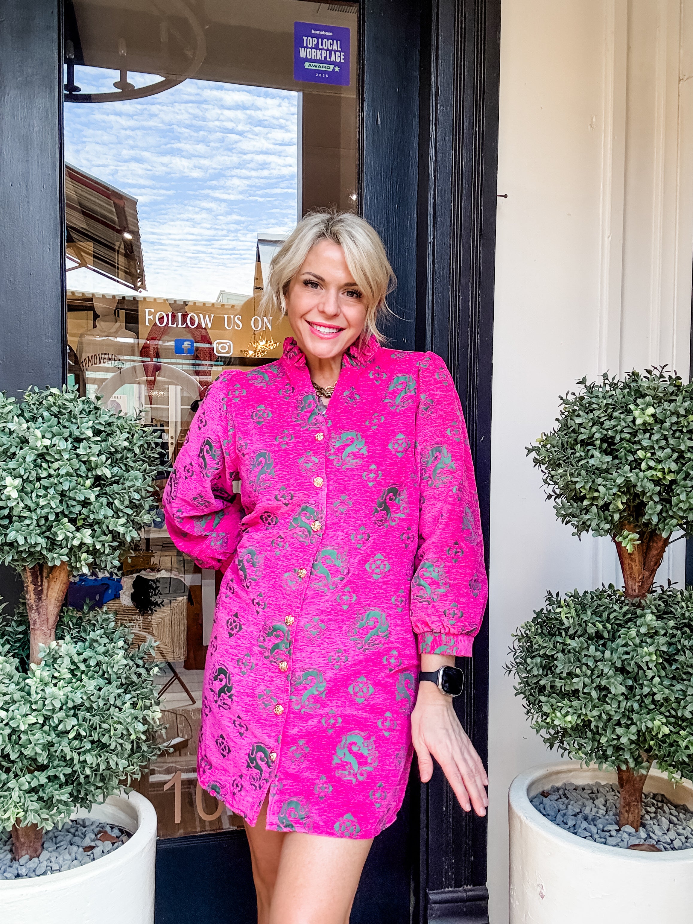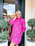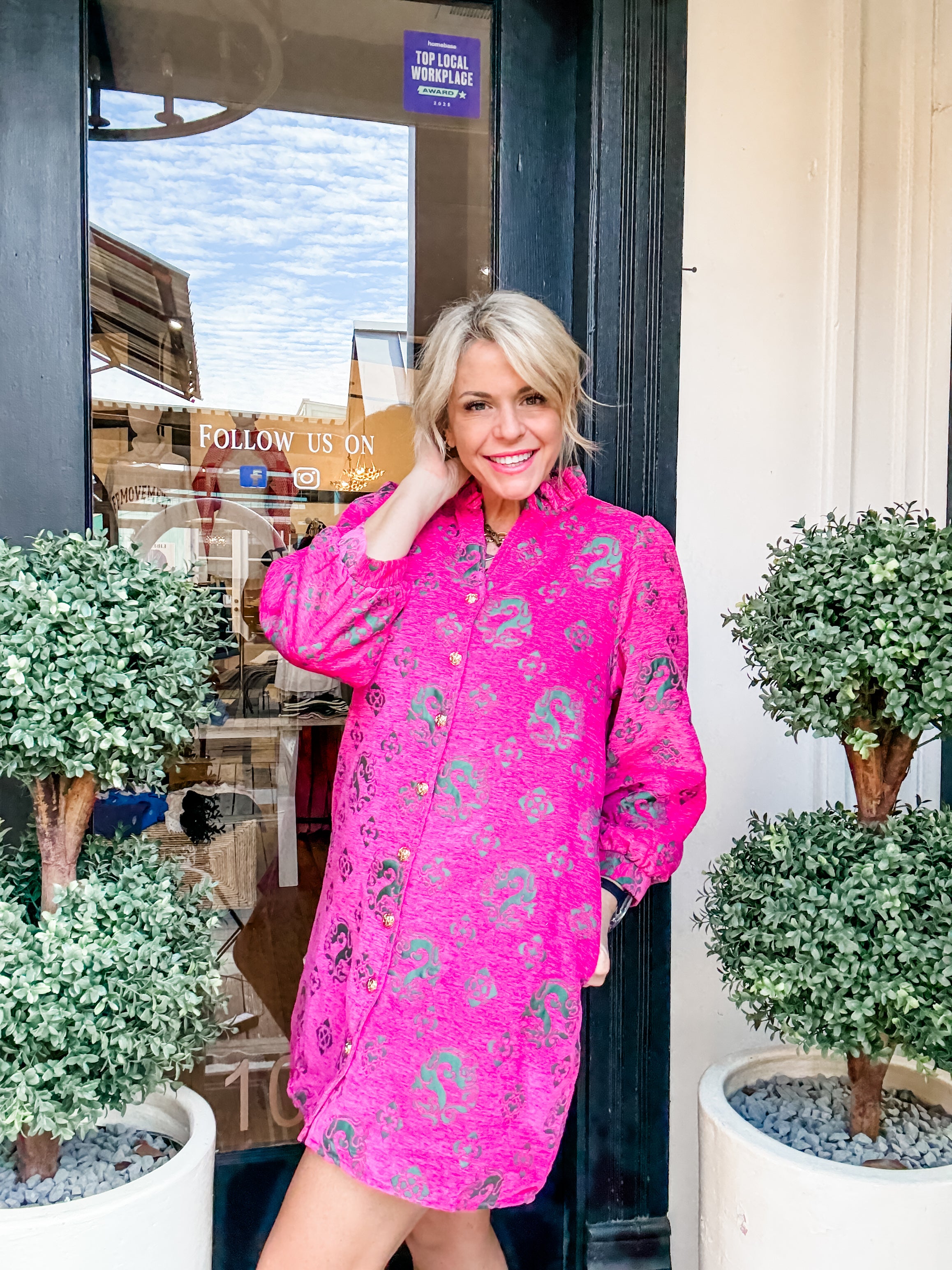 This charming button-down dress is designed for effortless everyday style. Featuring flattering 3/4 sleeves and a full front button closure, it’s finished with a soft ruffled neckline that adds a feminine touch. Thoughtfully placed side pockets offer convenience without compromising the silhouette. Comfortable, timeless, and easy to style, this dress transitions seamlessly from casual days to polished outings.