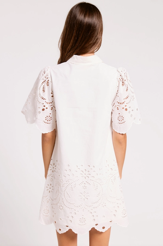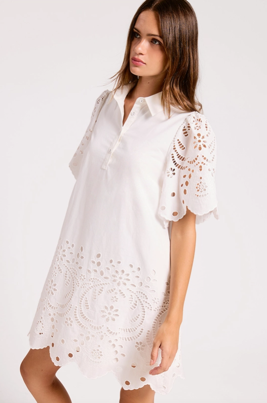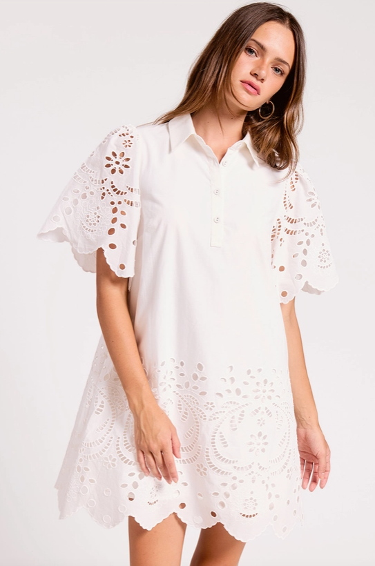 Sweet, feminine, and effortlessly wearable — this eyelet mini dress is a must-have for the season. Designed with intricate scalloped detailing and soft puff sleeves, it brings a romantic touch to an easy, flattering silhouette. The delicate eyelet texture adds dimension, while the mini length keeps it fresh and playful.