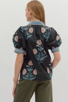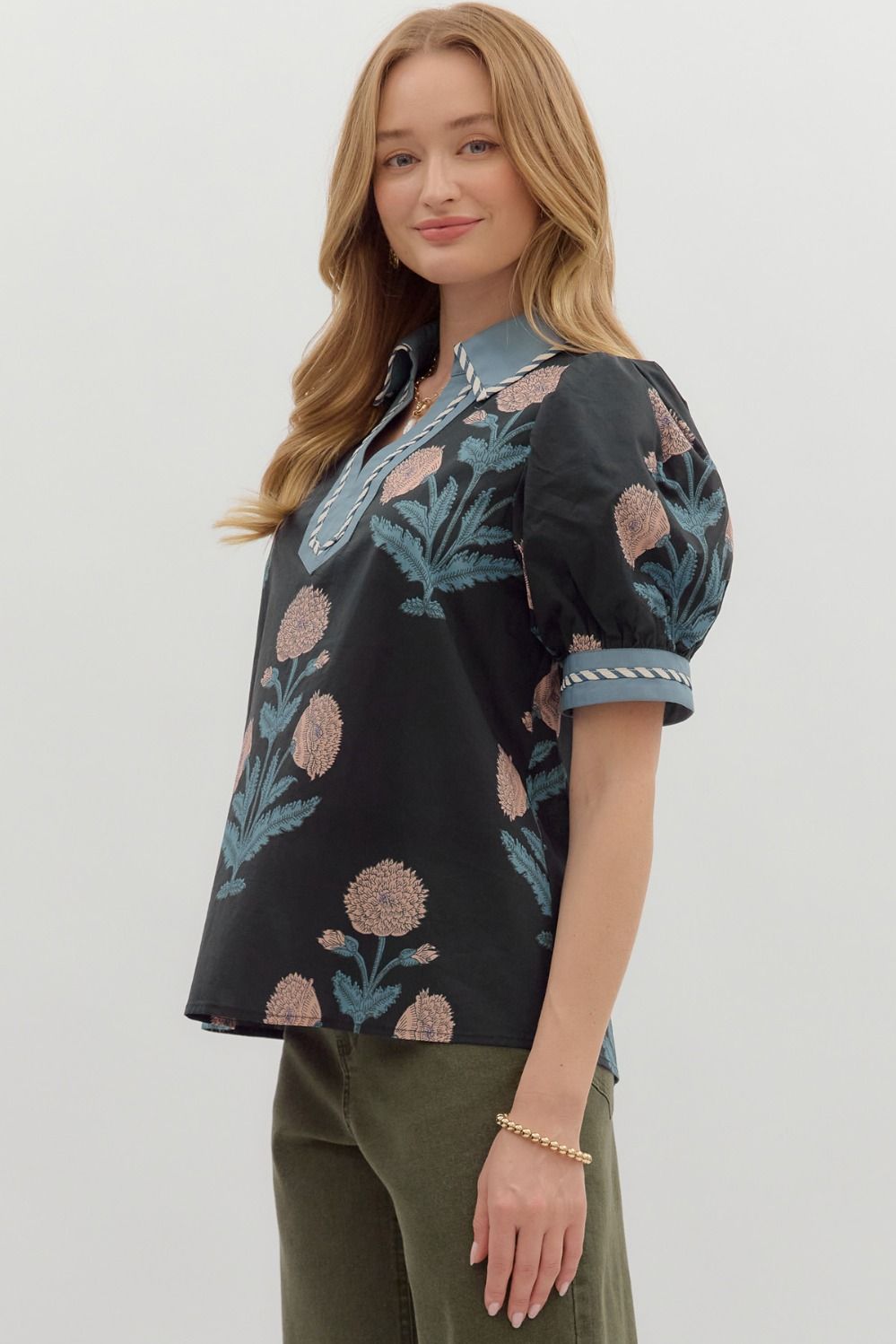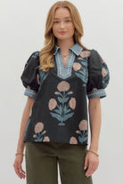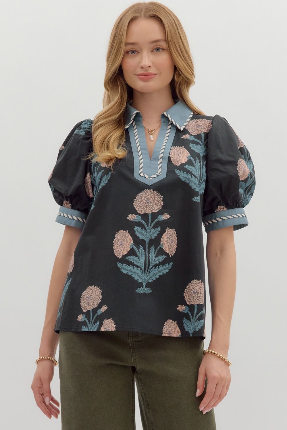 This navy top boasts a beautiful floral print and bubble sleeves for a touch of charm. The contrast v-neck collar and band with binding insert detail add a unique twist to this classic piece. Make a statement in the Winslow top!