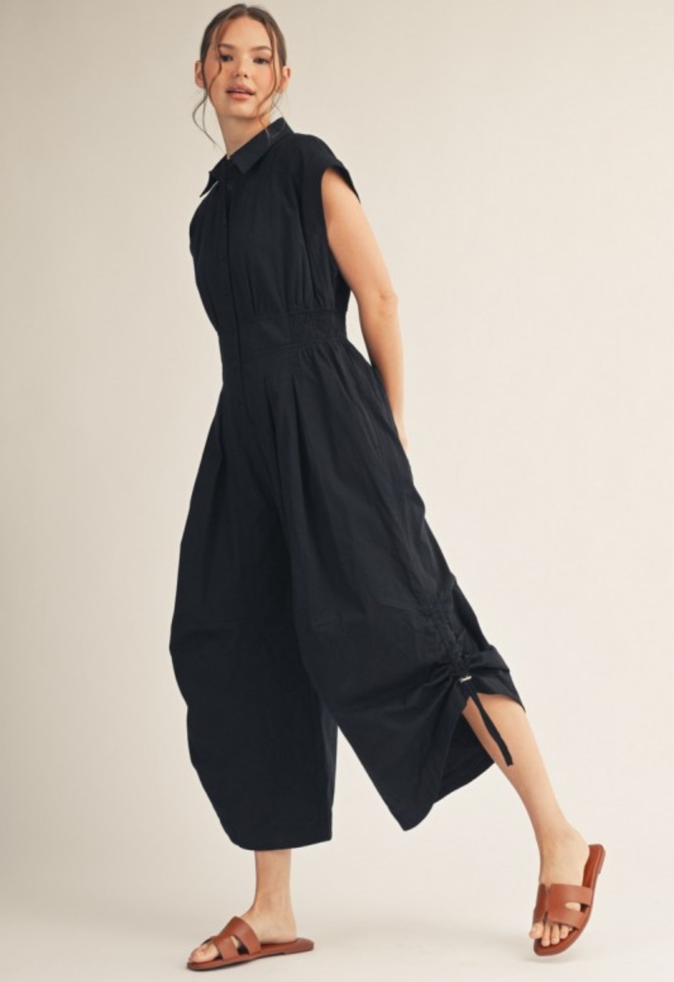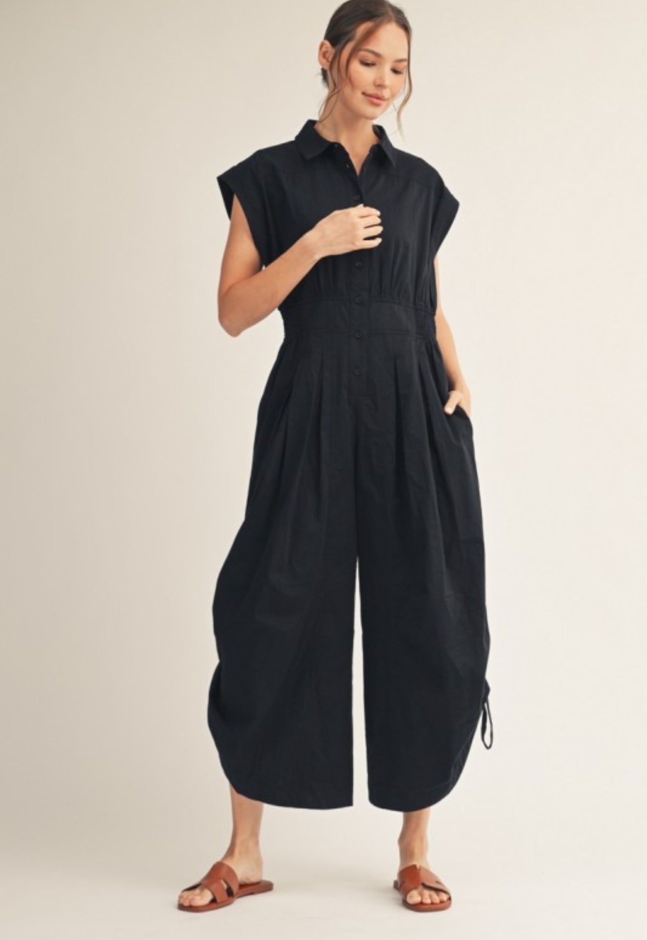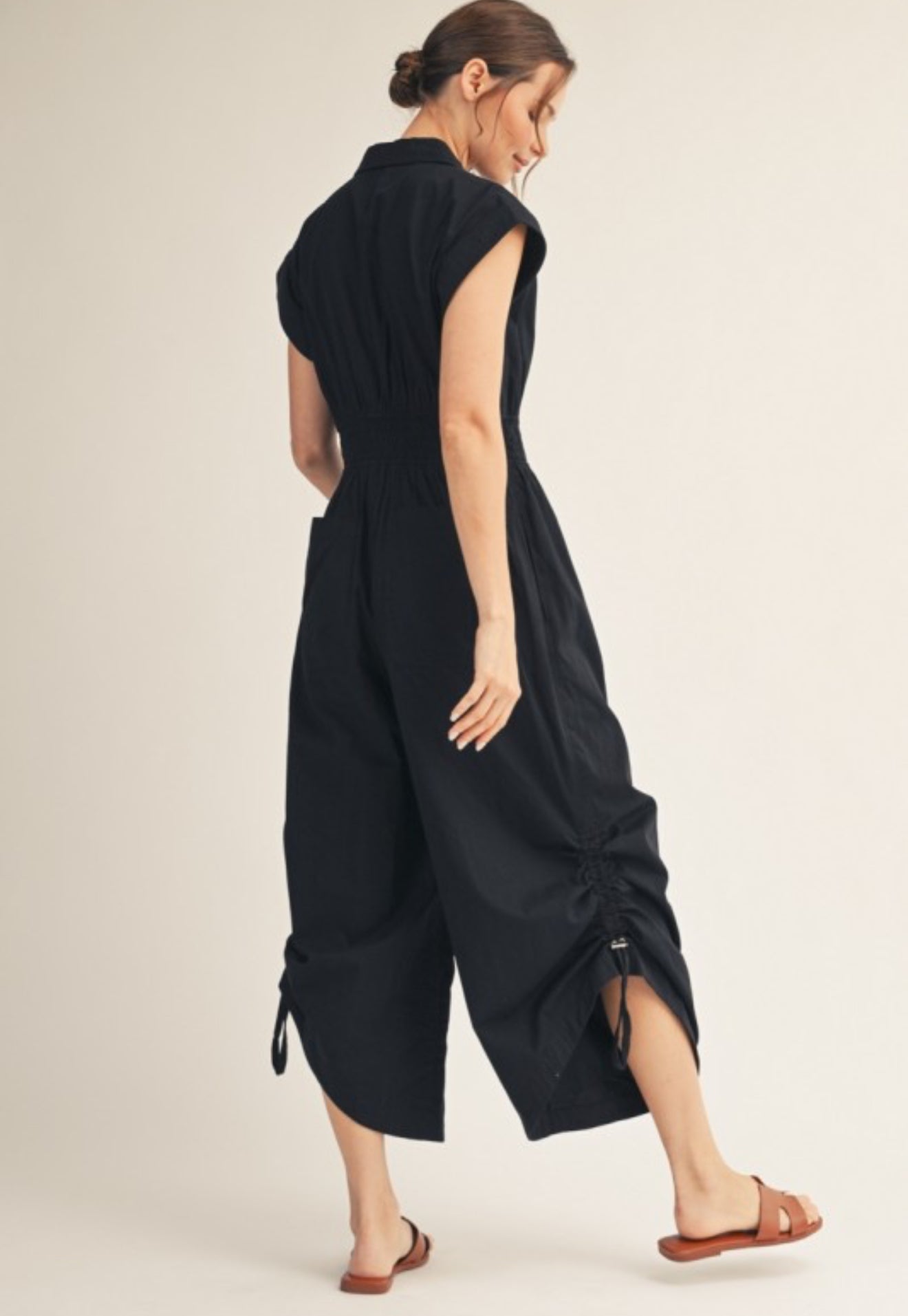 An easy wide-leg jumpsuit with side drawstring hem detailing for a laid-back yet styled finish. Comfortable, flattering, and endlessly versatile.