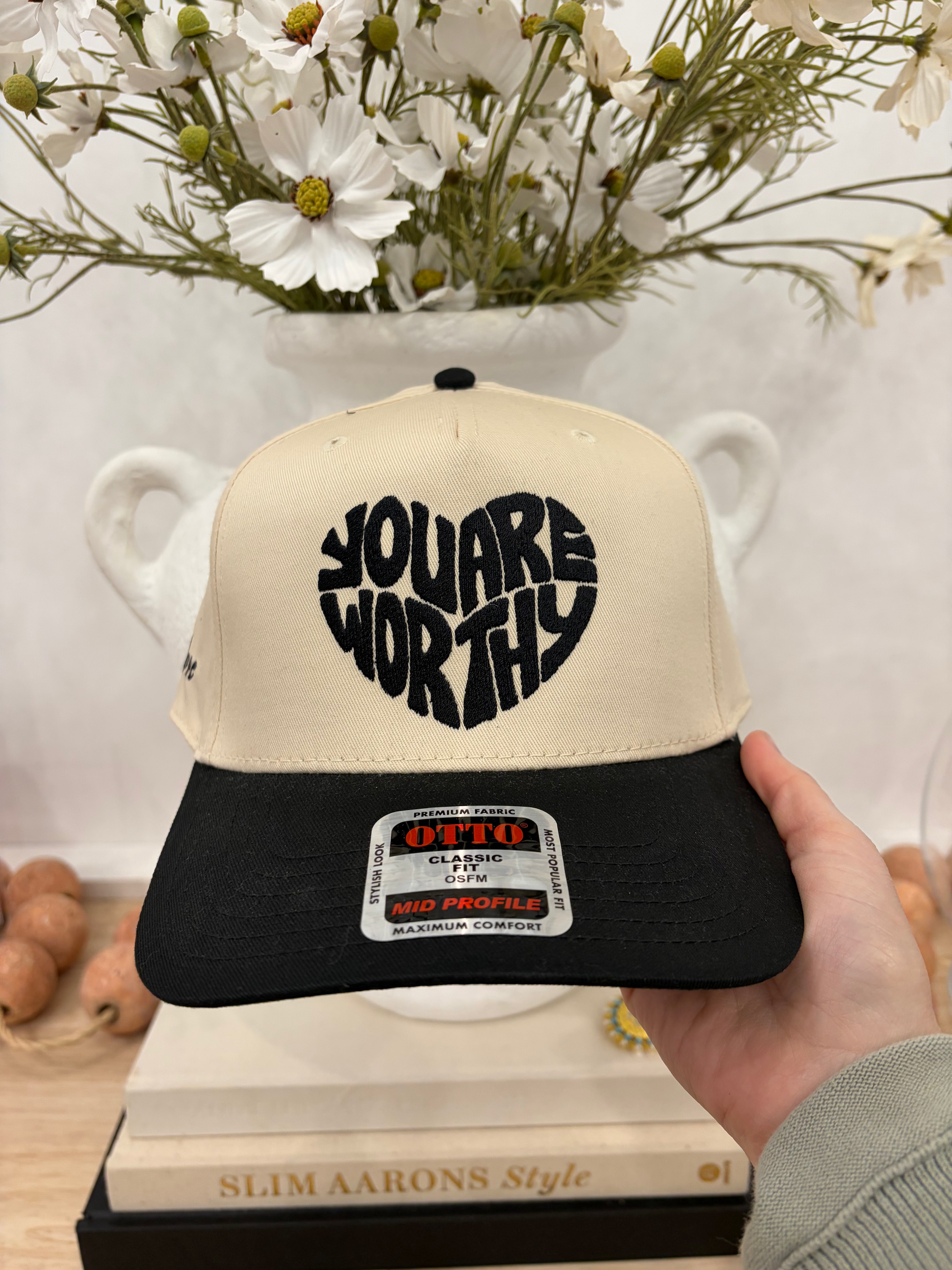 Wear your confidence with this charming cream hat featuring bold black lettering that declares "You are Worthy." Perfect for those moments when you need a little reminder that you've got this. Whether you're heading out for a casual day or want to spread positive vibes, this playful accessory combines comfort with an uplifting message. A fun way to celebrate yourself and inspire others around you.