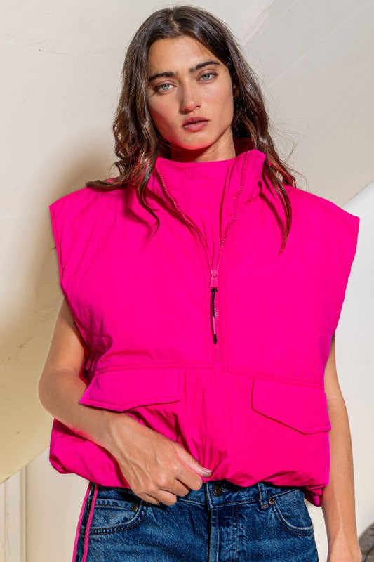 Add a bold pop of color to chilly days with this oversized fuchsia puffer vest—where cozy meets cool. Designed with an exaggerated silhouette for maximum comfort and style, this vest is your go-to for layering over everything from fitted long sleeves to chunky knits. Pair it with leggings, denim, or even a casual dress for that effortlessly off-duty vibe. Perfect for crisp fall strolls, winter errands, or après-ski moments, this piece is made for layering on the warmth without sacrificing style. Just add a beanie and boots, and you’re golden!
