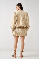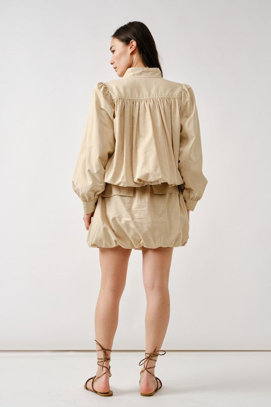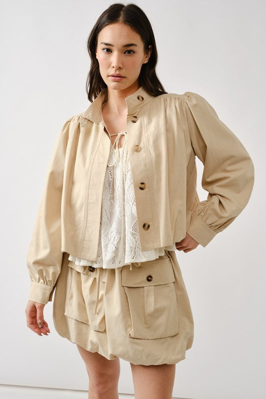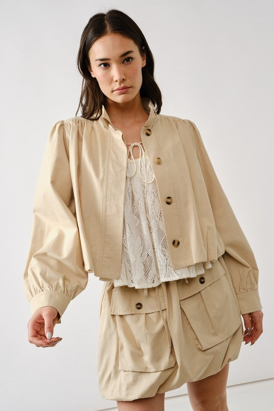 Meet your new statement layer: this balloon trench jacket blends bold structure with effortless elegance. Featuring a high neck and pleated detailing at the shoulders and cuffs, it brings volume and a fashion-forward twist to a classic silhouette. The dramatic puff sleeves add a touch of feminine drama, while the button-down front gives you endless styling options—wear it open as a chic outer layer or buttoned up for a sculptural, standout look.