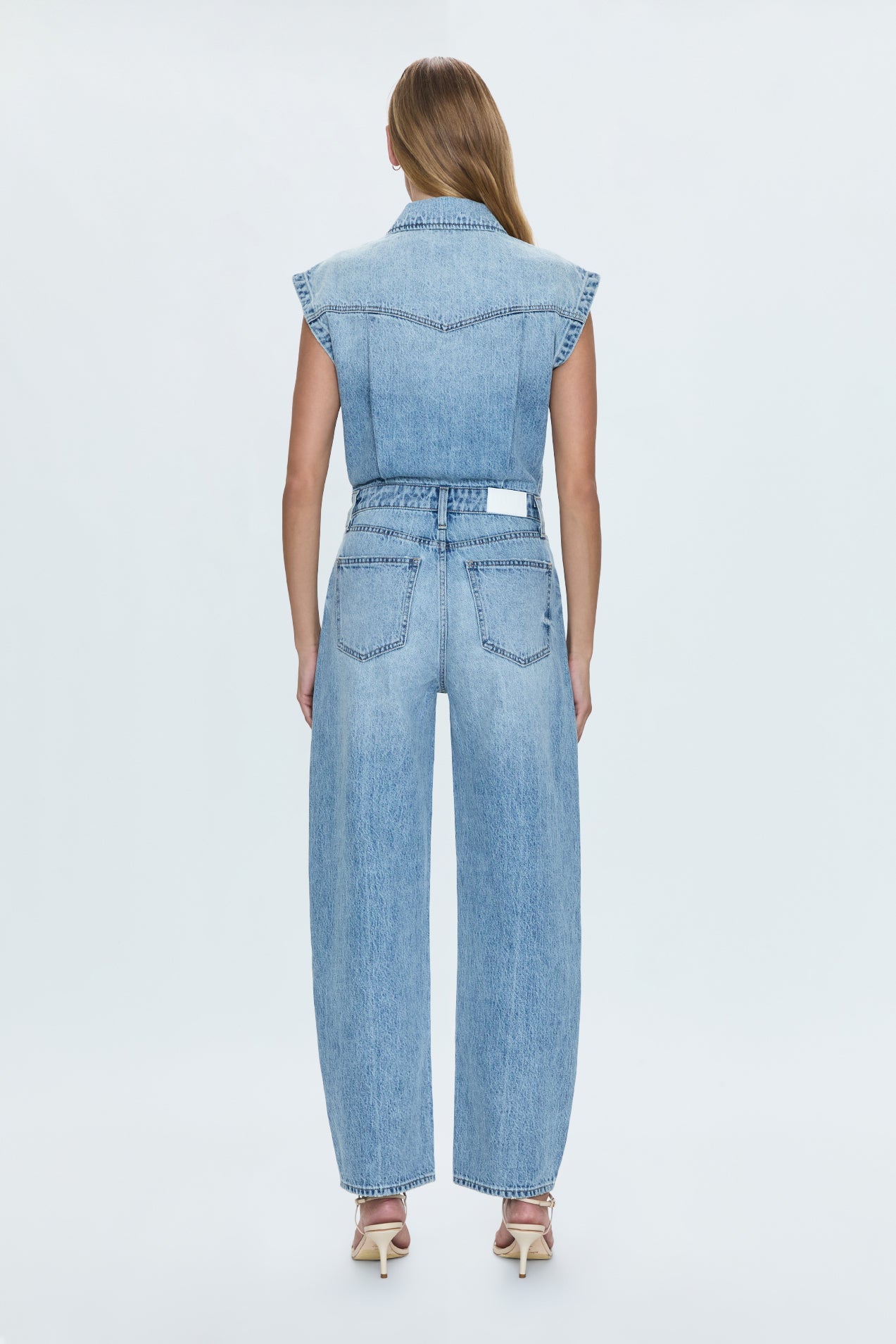The Ace jumpsuit boasts a strong shoulder, nipped waist and barrel leg silhouette, cut in rigid indigo denim and washed in a light vintage wash.