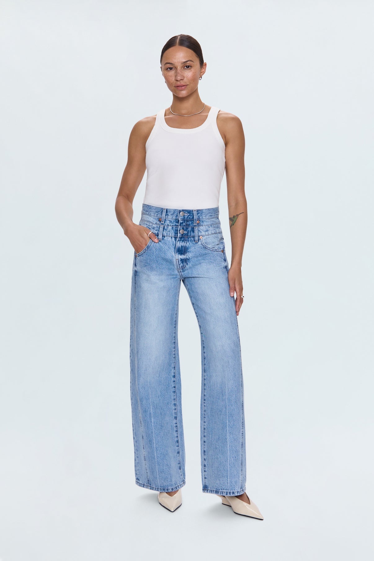 Pistola high rise denim with a relaxed, wide leg silhouette and full length hem. Defined by a double stacked waistband and elevated side seam details. Era is a light blue denim wash with clean finishes and free of fading or distressing.