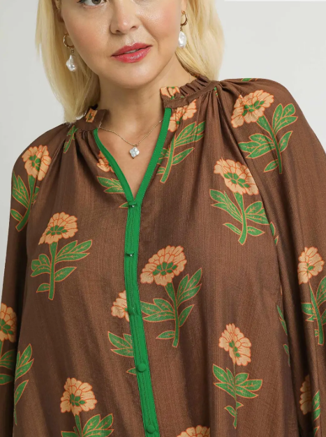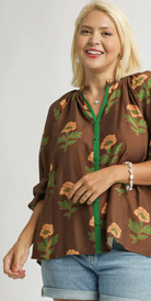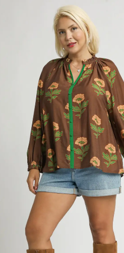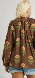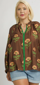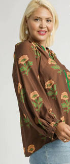 Add effortless charm to your wardrobe with this floral print button-front blouse, designed with a V-neckline and a soft, relaxed silhouette for all-day comfort. The long sleeves feature elastic ruffle cuffs, adding a touch of feminine movement, while the contrast binding offers a refined finishing detail. Lightweight and unlined, this flowy blouse is perfect for pairing with jeans, skirts, or tailored pants for a polished look that transitions seamlessly from day to night.