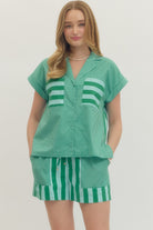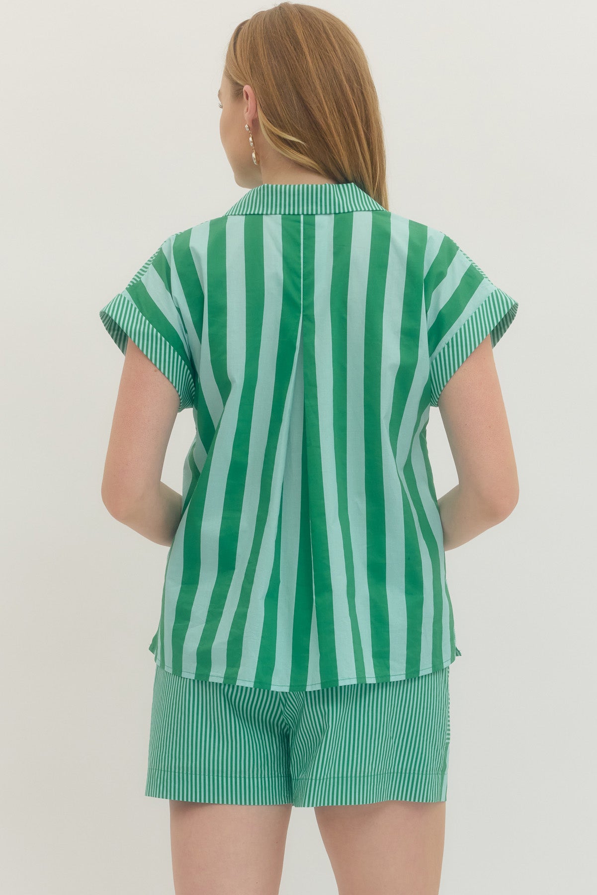 Fresh, playful, and made for sunny days — this green stripe top is a must-have for spring and summer styling. Featuring crisp striped detailing in a vibrant green hue, it adds the perfect pop of color while keeping your look effortlessly polished.