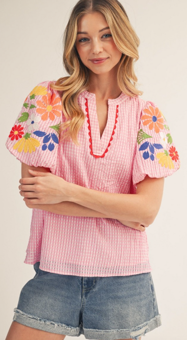 This short puff sleeve gingham check top blends classic patterning with delicate feminine details. Designed with an embroidered accent for added texture, it features a notched V-neckline that flatters the neckline while keeping the look relaxed. Scallop trim detailing adds a soft, decorative finish, complementing the puffed sleeves for a playful yet refined silhouette.