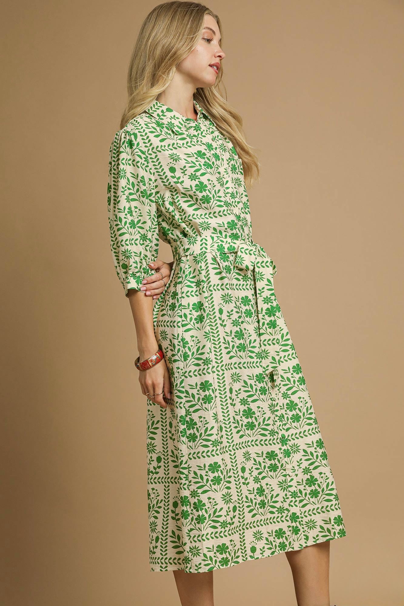 This dress is effortlessly charming with a timeless, elevated feel 🤍🌿A cream midi dress featuring an allover green botanical print that feels fresh, classic, and artfully detailed. Designed with a soft collared neckline and a relaxed blousy bodice, it cinches gently at the waist with a matching self-tie belt for a flattering, feminine silhouette. The three-quarter sleeves add polished ease, while the midi-length skirt flows beautifully for comfortable, everyday wear.