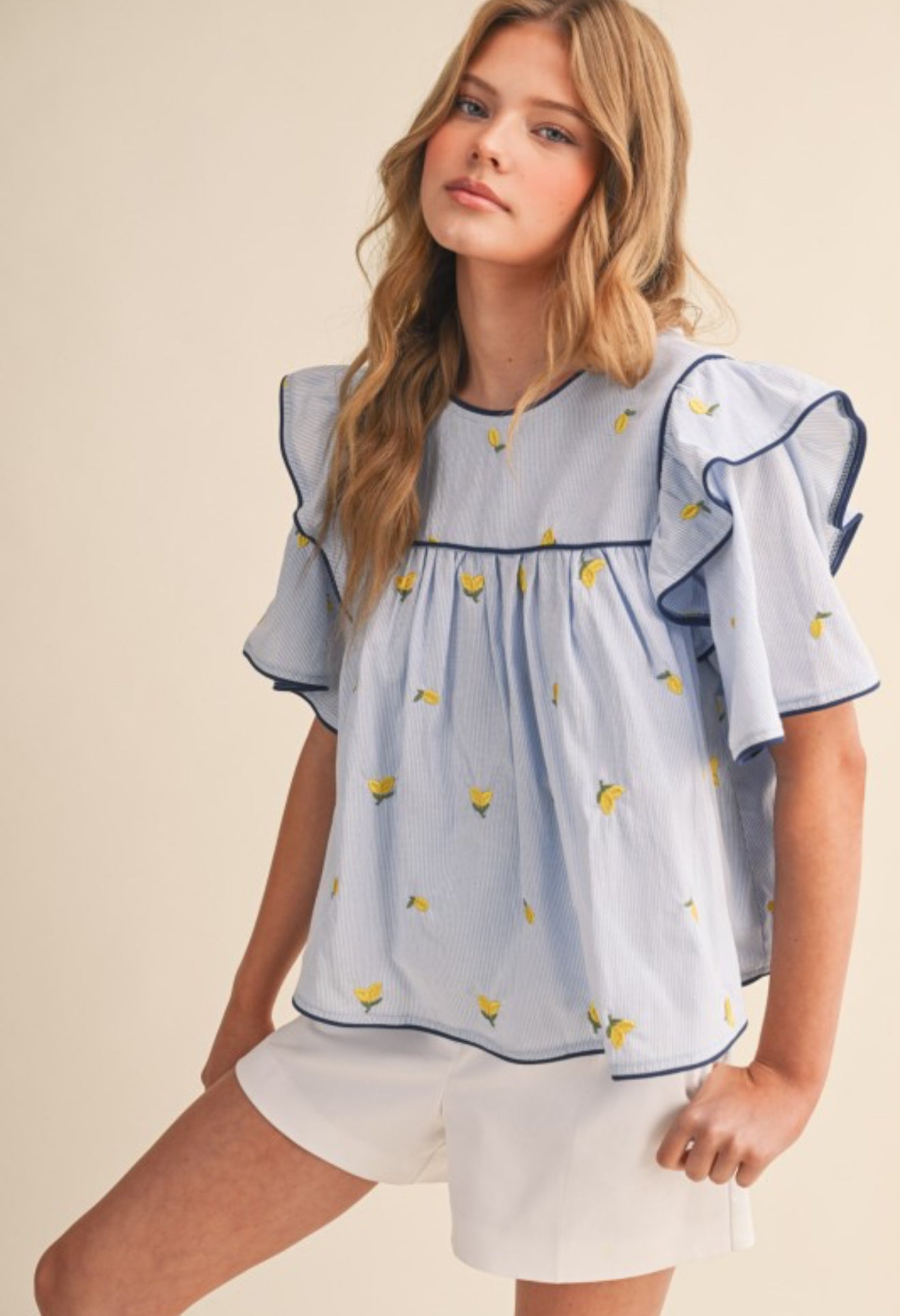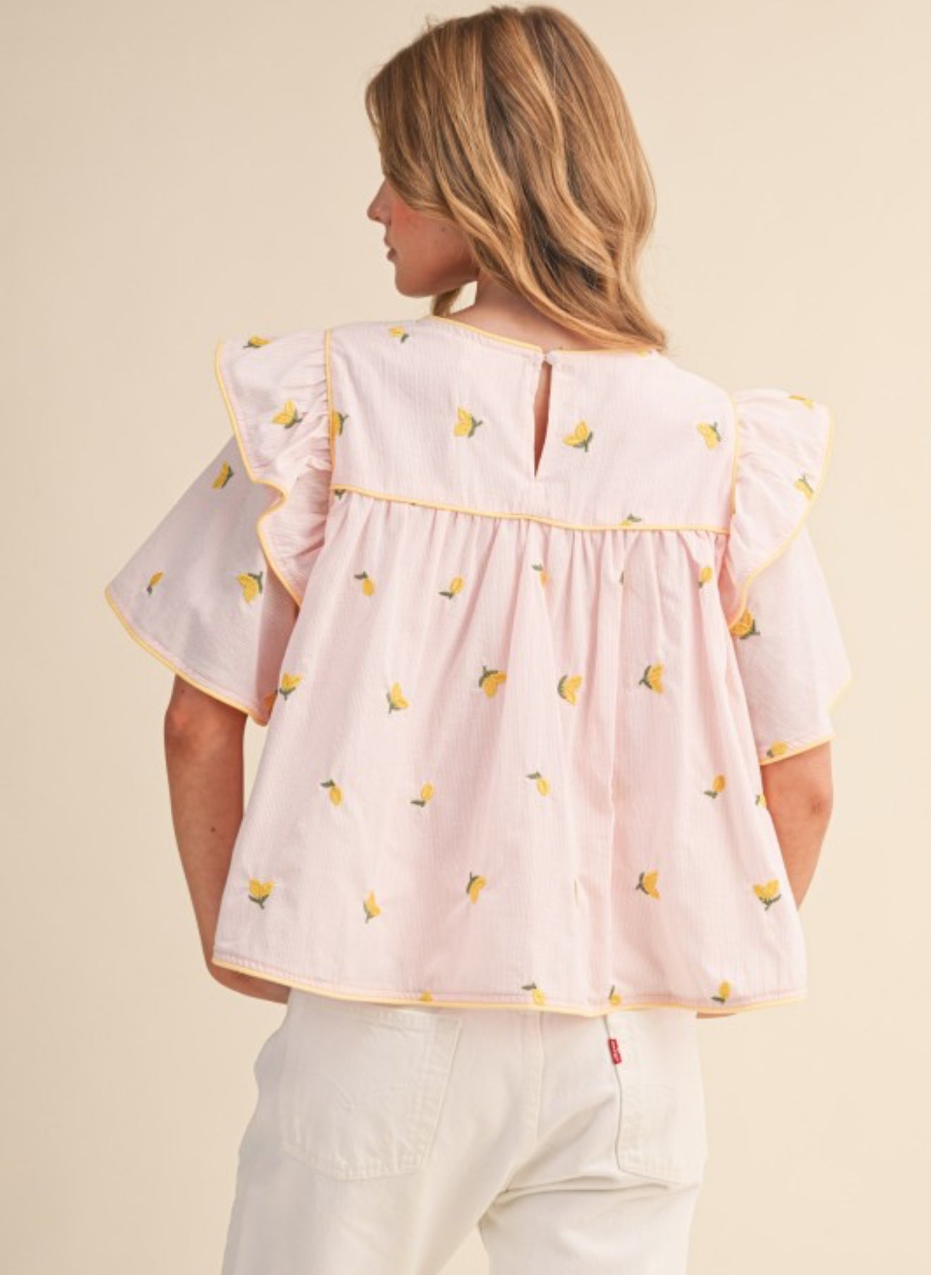 Sweet with a splash of citrus charm, this cotton top features playful lemon embroidery that instantly brightens your look. Designed with a ruffled yoke and crisp contrast piping, it adds just the right amount of feminine detail while keeping things light and effortless.