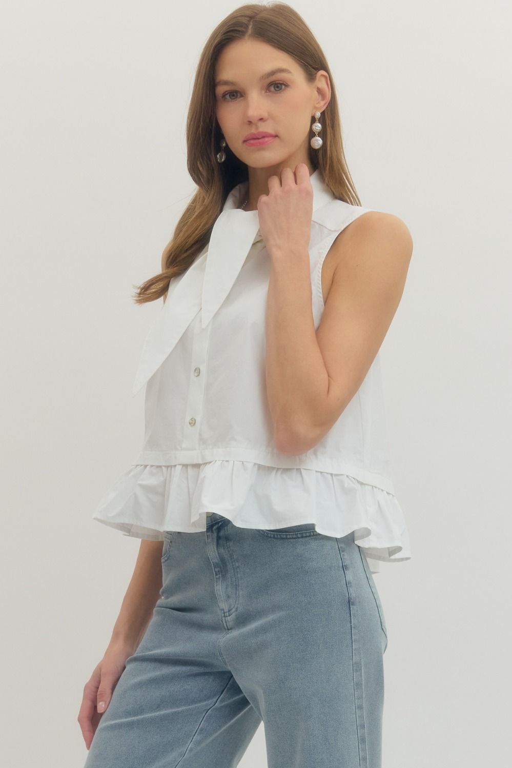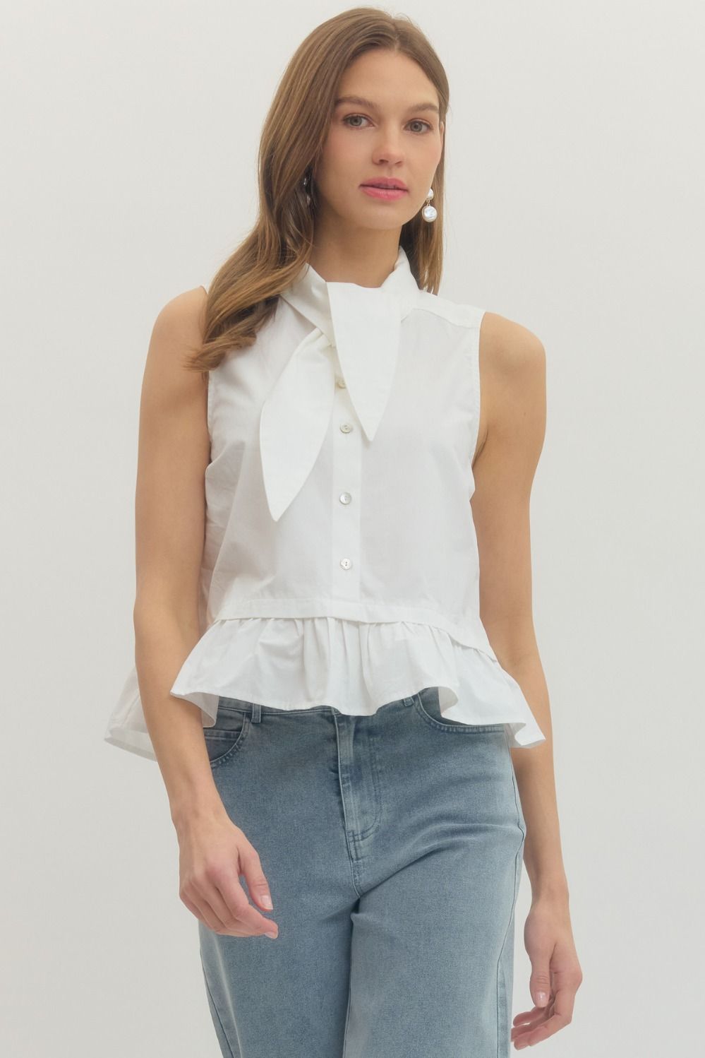 Feminine, polished, and effortlessly versatile, the Minnie Sleeveless Top is a charming piece perfect for both casual and dressed-up looks. Designed with a delicate Tie-neck detail this sleeveless top adds a soft, romantic touch while the front button closure brings a classic finish.