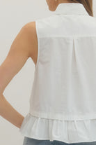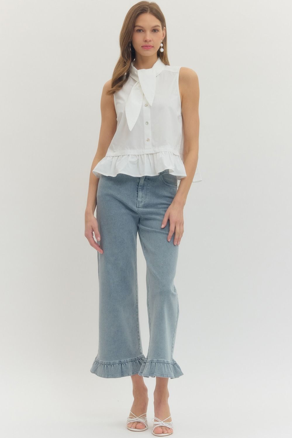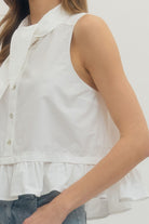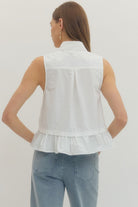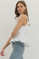 The ruffle hem creates beautiful movement and adds a playful, flattering shape that pairs perfectly with denim, trousers, or skirts. Crafted from a lightweight woven fabric, this top is non sheer and unlined, making it breathable and comfortable for everyday wear.