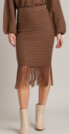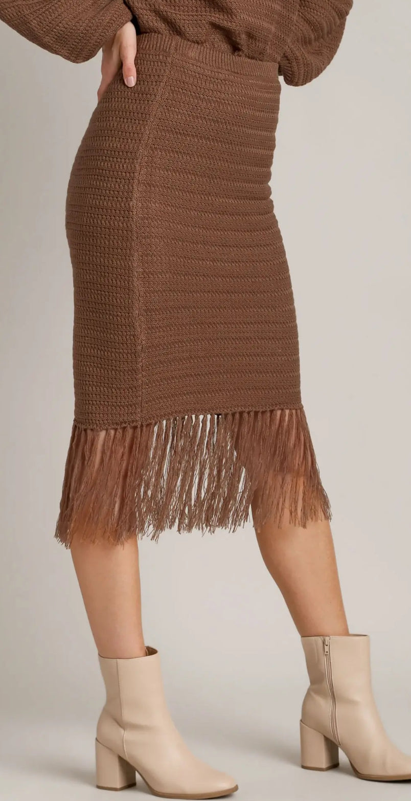 A knitted midi skirt with fringe is a cozy-chic piece perfect for fall and winter. Made from a soft wool or chunky knit, it falls mid-calf and moves beautifully with its fringe-trimmed hem. The texture adds warmth and style, pairing perfectly with boots and a turtleneck for an effortlessly elegant cold-weather look.