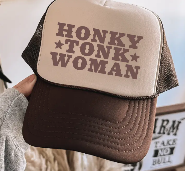 Show off your country spirit with this brown trucker hat featuring the bold “Honky Tonk Woman” on the front. Designed with a classic trucker silhouette, it combines a structured front panel with breathable mesh back panels for all-day comfort.