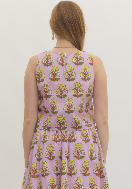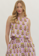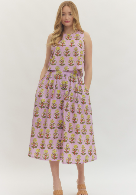 This charming two-piece set features a sleeveless, relaxed-fit top paired with a matching midi skirt for an effortlessly coordinated look. Crafted in a soft, lightweight fabric, the set is adorned with an allover botanical-inspired print that adds a playful yet refined touch. The skirt is designed with a comfortable elastic waistband and a flowy silhouette that moves beautifully, making it perfect for warm days, casual outings, or vacation styling. Wear together for a statement look or mix and match with wardrobe staples.
