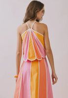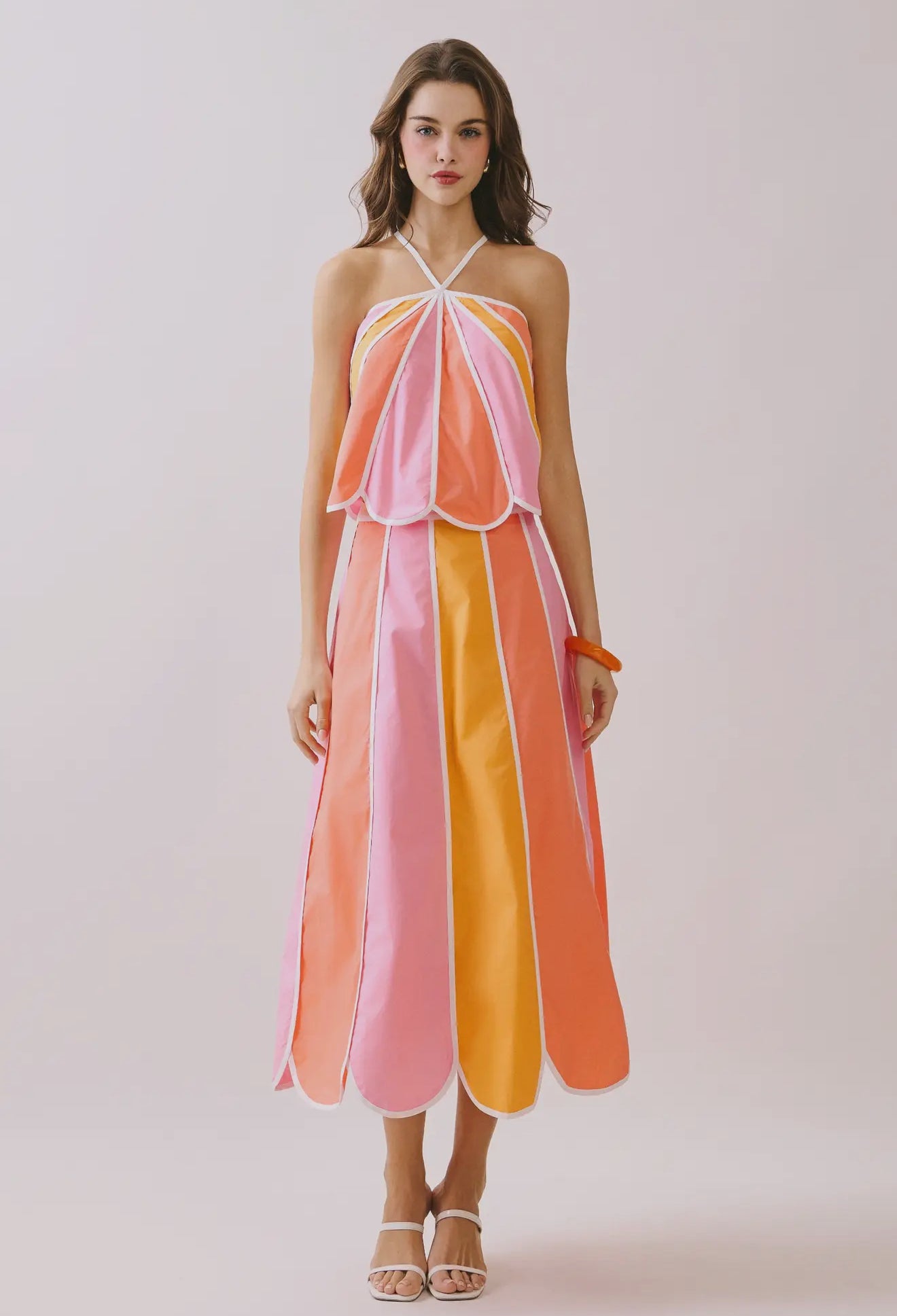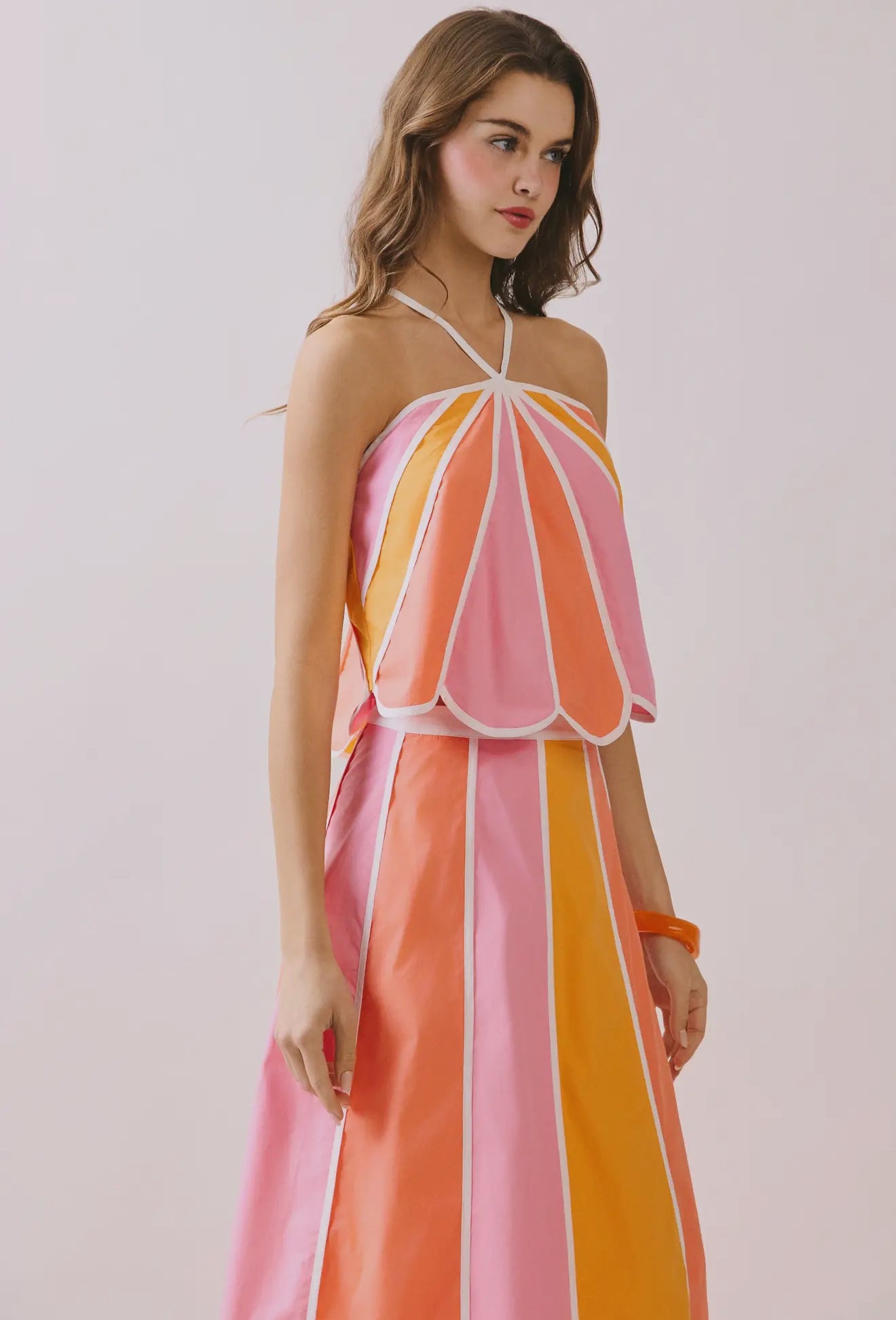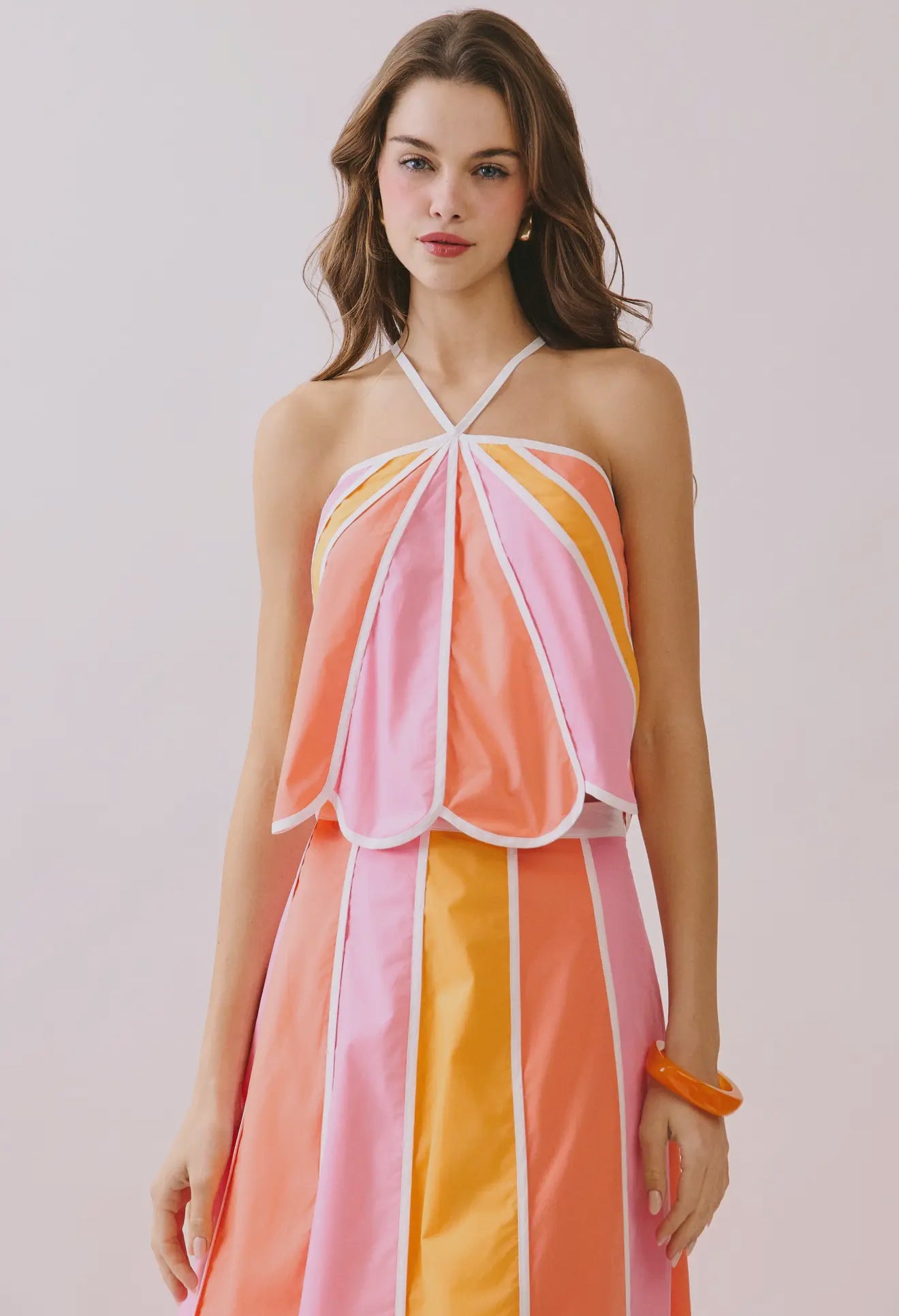 This color-block halter top set is a standout blend of playful design and effortless elegance. The halter top features paneled detailing with delicate scalloped edges, creating a beautifully finished look with eye-catching texture. A gathered neckline and flowy, relaxed silhouette give it an easy, breezy feel that moves with you.