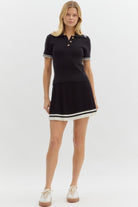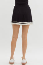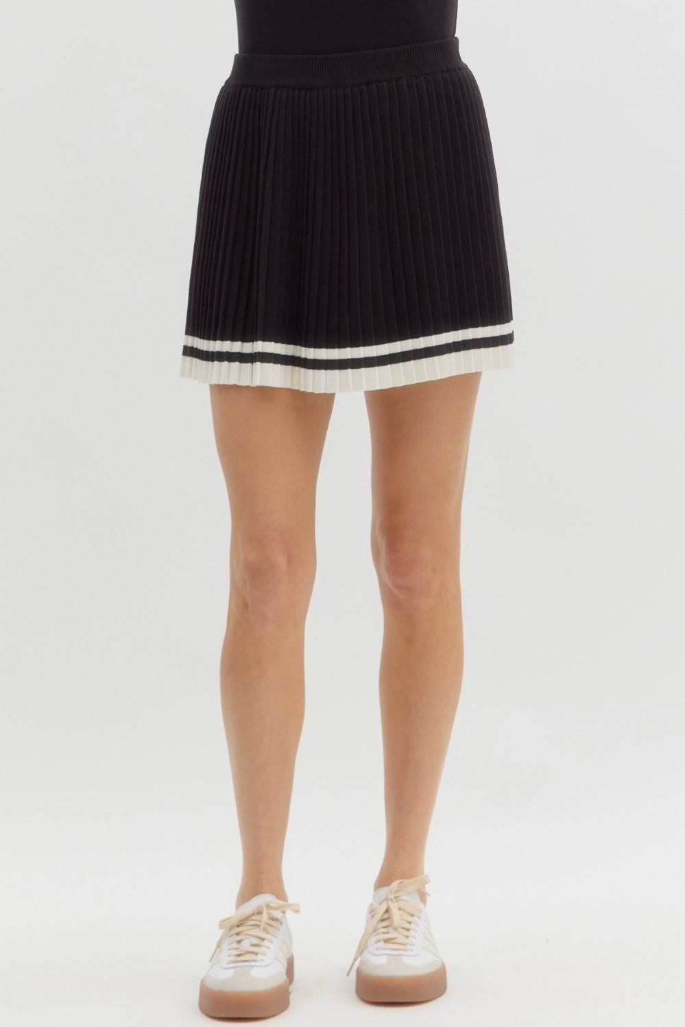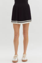 Playful meets polished in this solid sweater knit pleated skort. Featuring built-in lining shorts for comfort and coverage, it’s finished with a chic striped border accent at the hem. The elasticated waistband keeps it comfy, while the lightweight knit makes it easy to wear all season long. Pair it with a cozy sweater or a sleek top and sneakers for a sporty-chic vibe.