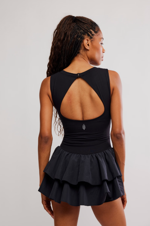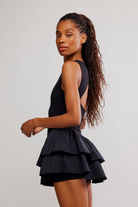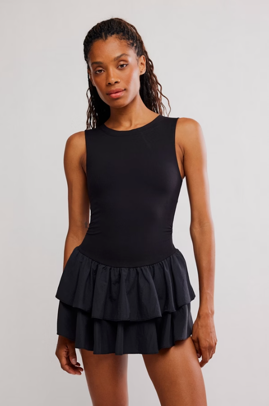 The perfect blend of sweet and sporty, this done-in-one skortsie is featured in a drop-waist style with ruffled bottom hem and built-in shorts for the perfect fun yet functional finish.
