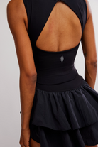 Features: Crew neckline; dropped-waist style; built-in shorts; keyhole closure at back; slight ruching at waist