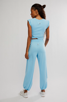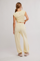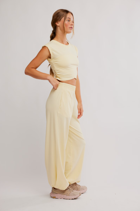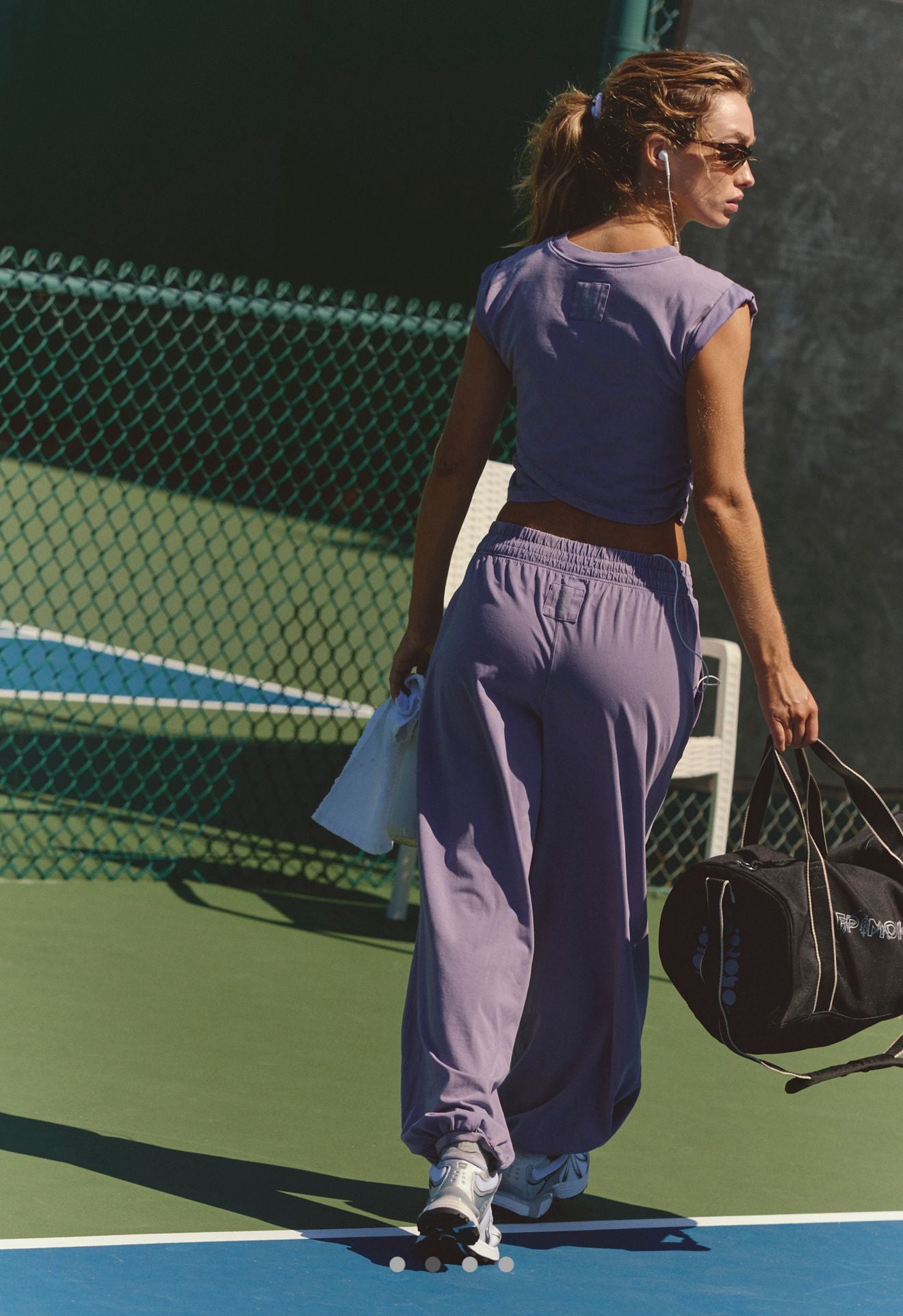 • Perfect for workouts and daily outing, the FP Movement™ Hot Shot Crossover Set is effortlessly comfy. Featuring a super soft fabrication and perfectly lived-in look. This relaxed fit set has ankle length pant, cropped muscle tee top with seaming detail; ankle length pant with high-rise waist, wide leg, elasticated waistband and cuffs. It comes with crossover detail on top, ribbed collar, and side seam pockets.